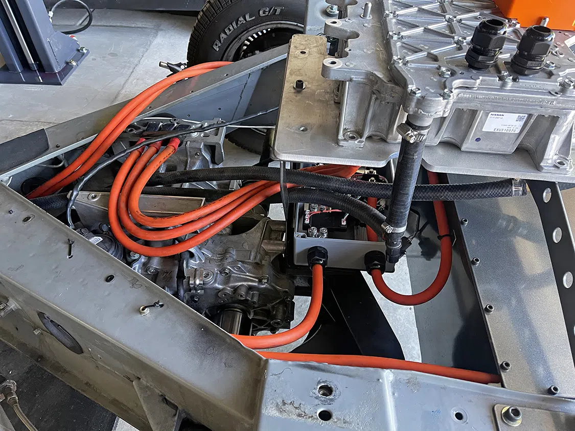 Jacob selected the 2016 EM57 Nissan Leaf motor, producing 80kW and 250nm, for his soon-to-be electric DeLorean. Once he confirmed it would fit, he pulled the engine out and started grafting the Leaf motor into the car. The motor installation, a critical step, was achieved through custom-designed mounts that cradled the Leaf motor without altering the DeLorean’s frame.