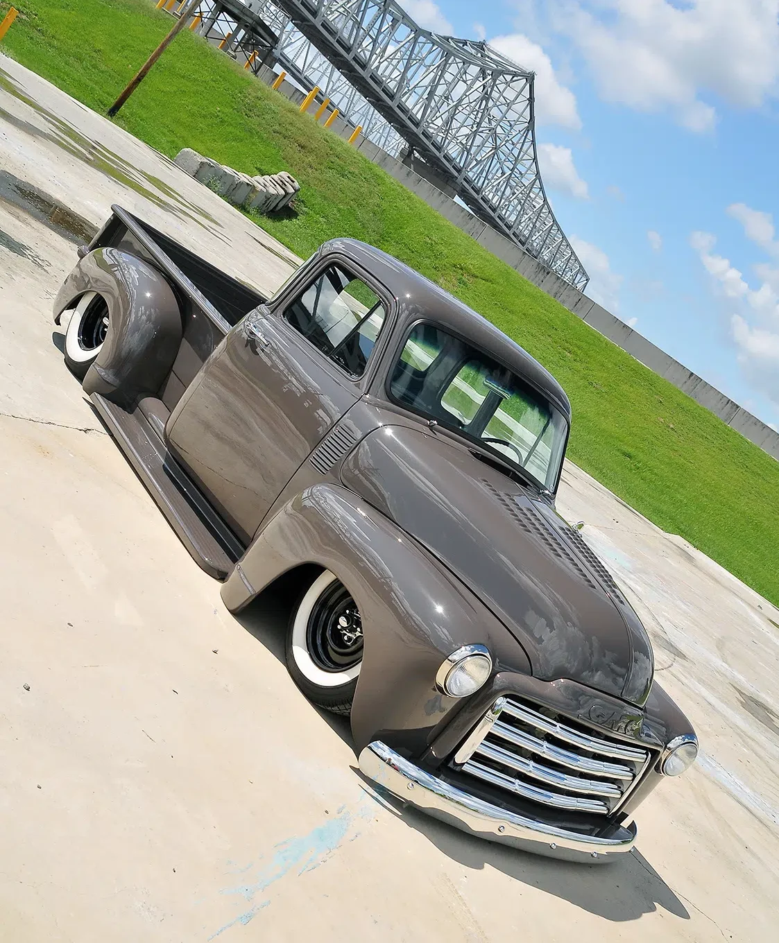 Originally, he planned to go with a Nardo Gray, but when Choppa tested a sample on the truck, his wife, Donna, said, “Absolutely no!” The search was back on as he tried to find something that would be unique enough to stand out and also please the wife. The final choice was a mixture blend starting with a ’50s style Sherwin Williams Volkswagen color and mixed with tan and beige. The wife agreed, and finally Kerry “Duck” Cunningham—a good friend who had painted his fair share of feature trucks—did his magic on the classic GMC.