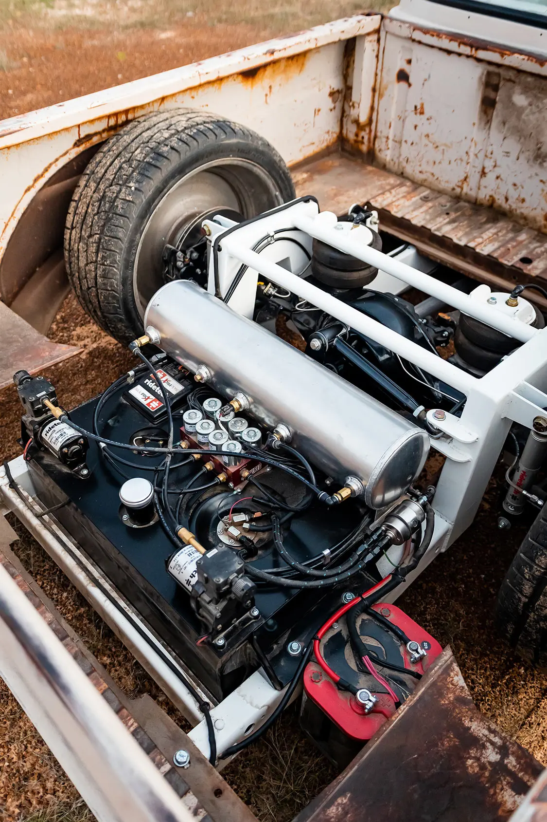 The truck has seen various ride height levels throughout the years, but to achieve its current stance, Shannon entrusted a Scott’s Hot Rods front suspension kit and an AVS rear 4-link setup to help provide a more aggressive altitude as well as an elevated ride quality than before. Full air ride allows for height adjustability to give the truck all the room it needs to fully function while in motion—plus, there’s nothing cooler than being able to air an old truck out on the ground. A tall rear frame notch had to be fabricated in order to fit the Ford 9-inch pumpkin, but Shannon made quick work of that before ordering the perfect set of wheels to blend in with the truck’s developing style.