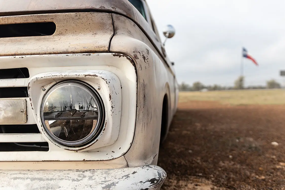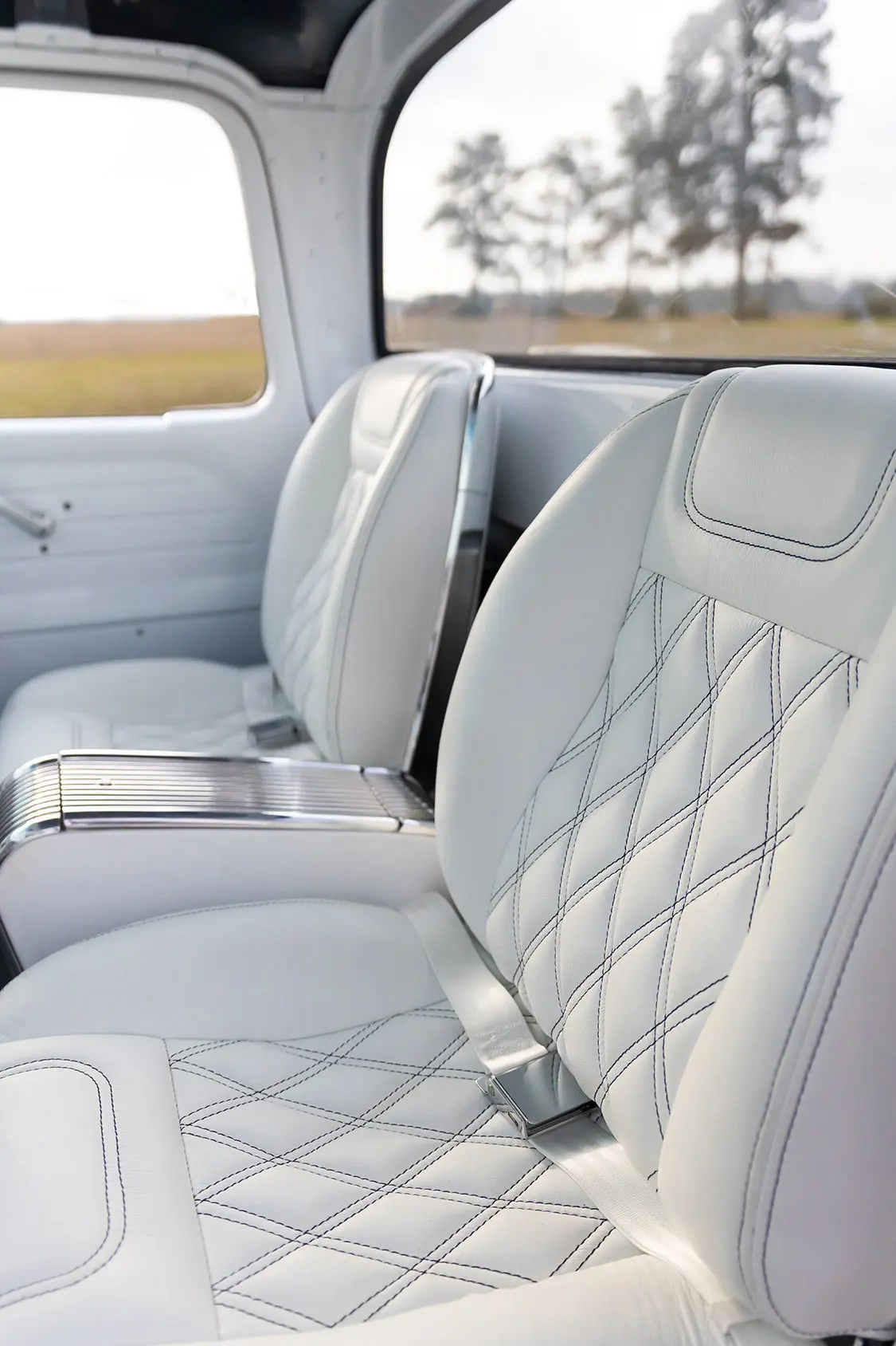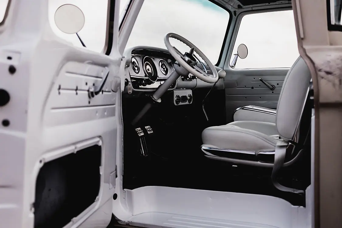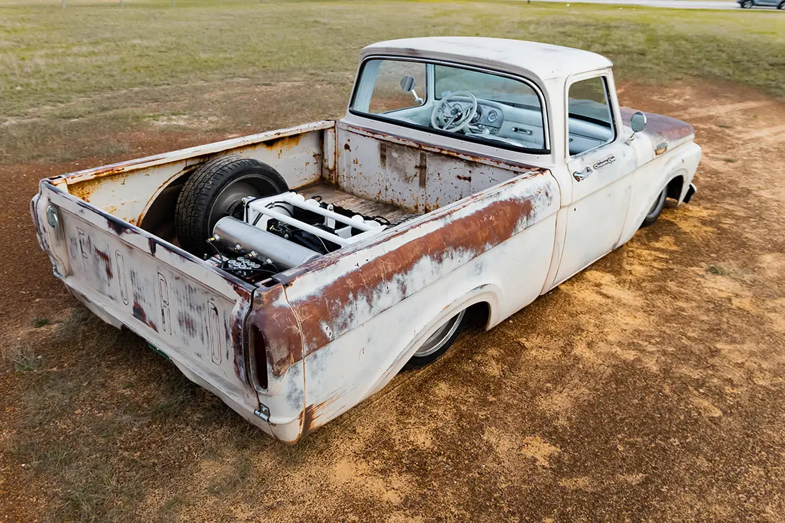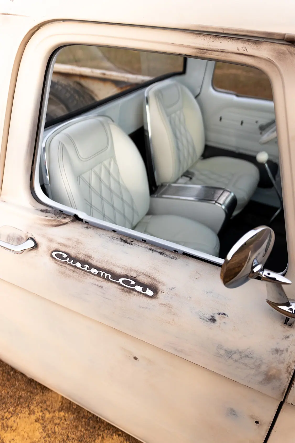 Although Shannon has an affinity for the look of natural patina, he wanted a much more polished atmosphere inside the cab. Dominic Olson at Big O Fabrications in Colorado Springs reworked a set of Ford Galaxie bucket seats and a center console from a Mercury Comet, and then finished them off in luxurious white leather and excellent stitchwork. Dakota Digital gauges, a Speedway Motors steering column and CON2R steering wheel all came together to upgrade the F-100’s cockpit while lending a clean vintage appearance to the command center. Shannon admits that the cab space is still a work in progress, but it has come a long way so far and will be heading further in the direction of providing a true VIP experience to its occupants.