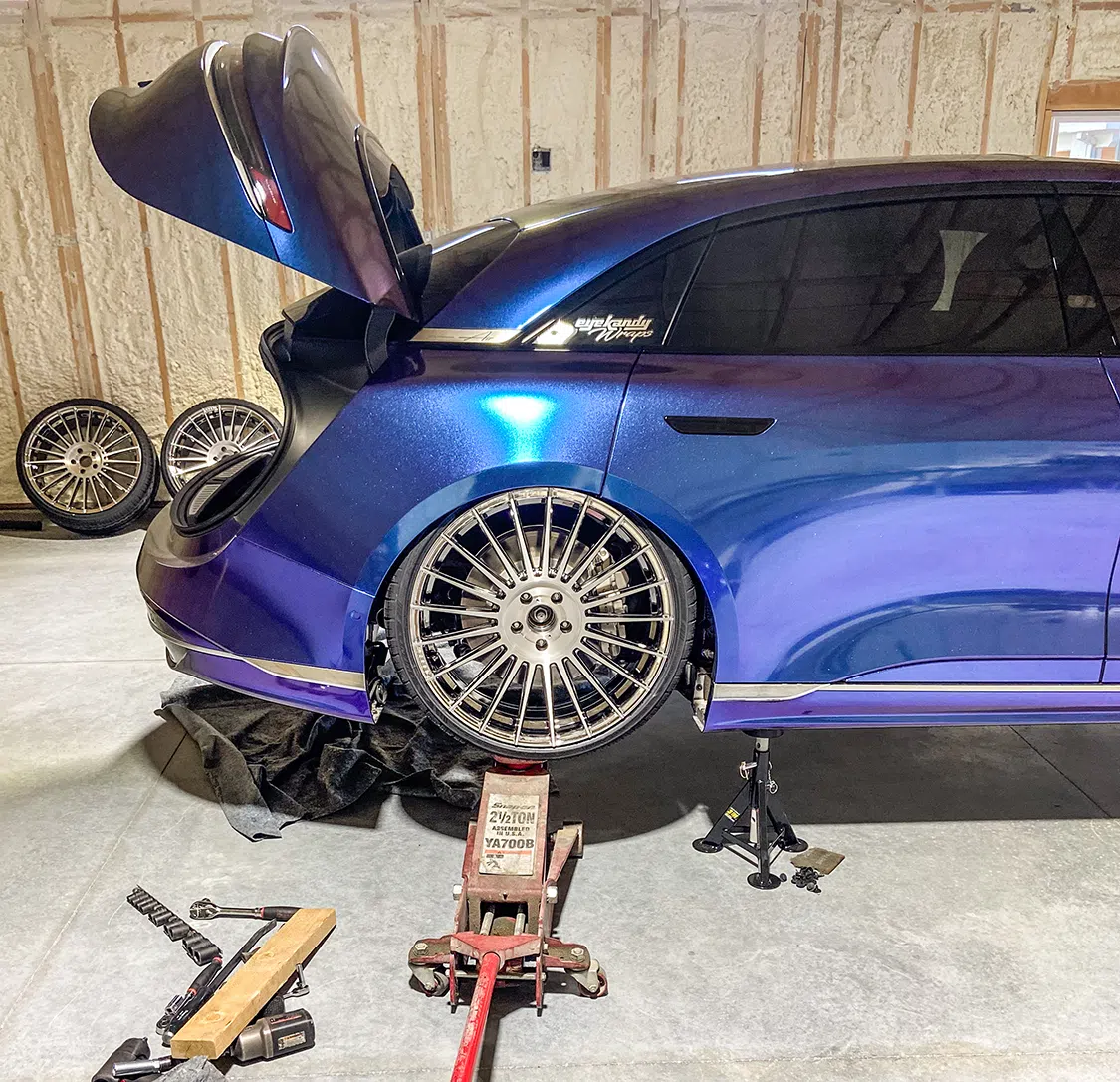 RJ got with Air Lift Performance and ordered the air management needed to control the new suspension height options. He started with two Viair 444 compressors (P/N: 44442 with a $350 retail), a 24-inch FLO air tank (P/N: 15224 with a $320 retail), an 18-inch FLO air tank (P/N: 15218 with a $305 retail) and the Air Lift 3P manifold (P/N: 27780 with a $1,595 retail). That handled the controlling of the suspension, so now for the fun part, trying to get the struts figured out. After a call to Universal Air, they said they would handle designing and cutting the correct strut mounts and front bags as well as the mounts for the rear bags and once they finalized it, it would be a standard kit they offer with a $1,876 retail price. Now that the suspension components were enroute, a new set of wheels and tires was needed to complete the desired look. For this, Vossen Wheels stepped in to provide the 22-inch HF-8 wheels and Lexani Tire supplied the 255/30-22 tires. Being this is the first bagged Lucid Air, a lot of measuring and double-checking specs was required to make sure all of this was going to work together.