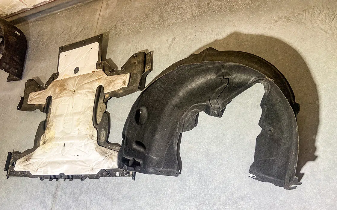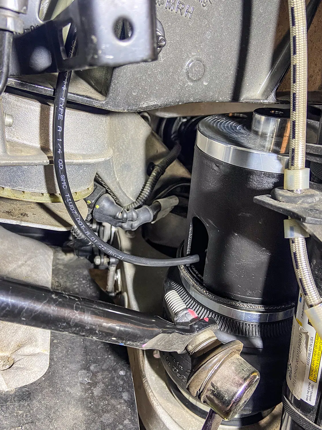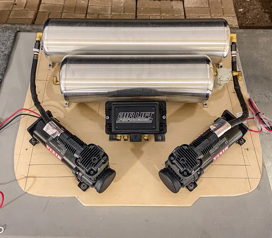 1. With all the air mangement parts laid out, a game plan could be made as far as mounting parts and running lines.2. The Lucid Air is equipped with adaptive suspension, which was unplugged from the front struts before they could be removed.3. The OEM front struts were removed and marked for the initial measurements for Universal Air to use to create the new air bag setup.4. The factory height sensor arms were disconnected to allow the suspension to come apart but was reinstalled with the new suspension and still works controlling the damping like it did from the factory.5. With the rear coil springs removed, you can see there is a pocket in the lower control arm where the spring sits with the lower spring cap. The rear doesn’t have struts like the front.6. The upper rear spring plate had a centering hole where the factory spring cap sat. This was important when getting the exact measurements for the new rear air bag brackets.7. The rear upper and lower spring caps have alignment pins that secure the springs to the car.8. With the car apart, it was time to ensure the new wheel and tire fitment would work with no issues. The factory tire was a 245/35-21 so bumping up to a 22-inch wheel, a 255/30-22 was the closest to the factory diameter to keep all the car’s advanced sensors performing correctly with the new setup.9. Universal Air machined upper and lower air bag mounts that include seals to slide over the factory front struts.9(A)10. The rear was different and Universal Air made upper and lower machined brackets and bag spacers to go along with the new air bags.11. With the new front and rear suspension components assembled, you can see where the front coil spring location now houses the air bag and the rear air bag assembly that replaces the rear springs.12. The factory rear spring and mounting plate on the left compared to the new air suspension on the right.13. The OEM parts that were removed from the stock front strut on the left vs the assembled air strut on the right. All mounting hardware fits in the factory locations just as it would stock.14. Before any air pressure was added to the new suspension, the new 22-inch Vossen wheels were bolted up and jacked into location to check for clearance. When prototyping a suspension like this, double checking fitment like this is crucial.14(A)15. The new front strut top plate has the same mounting holes as the factory one, which allows for direct fitment. The marked hole on each plate helped align the upper plate when reinstalling the front struts.15(A)16. The Lucid side skirts allow full access to run the air lines from the rear to the front so they can be connected to the Air Lift 3P manifold. It is recommended to use ¼-inch air line with this car due to limited space to run the lines.17. To get better access to mounting points in the fender wells and under the car, the wheelwell liners and rear under carriage trays were removed. This not only allows for easier access, but once reinstalled, provides protection for the air lines.18. When running air lines, keep them tucked away from any moving parts. The easiest thing to do is to run them alongside factory wiring or brake lines.19. Once the air lines and the wiring harness was run to the front of the car, finding the perfect hole to route them through can be tough on a double insulated car like the Lucid Air. But with a pick, Adam made sure the hole he wanted to use would work.20. The wiring harness and air lines were routed into the frunk, which provides plenty of room for the air management.21. For the Lucid Air, the 12-volt power for the air management was tricky to find due to it not being like most vehicles, but the electric panel on the passenger side kick panel allowed for the perfect connection.22. With the air management ready to go in and the hard parts installed, the air lines could be connected to the front struts and rear bags. Adam likes to run the four corners to shop ball valves and leave aired up overnight to check for leaks. This makes chasing down a leak once it’s 100% installed easier, because you can eliminate where it’s coming from with this one step.22(A)23. The compressors, air tanks, and manifold mount were laid out on the mounting board to figure out the best fitment for all the parts. Once the locations were determined, the holes were drilled.24. Tee nuts were placed into the bottom side of the holes to allow for not only easier assembly, but also easier repairs if needed down the road.25. Once the air management plate was assembled, it was set into the frunk, wired, and connected to air lines.26. The installed air management plate fit nicely into the frunk and has a clean, OEM+ look to it. The factory mid panel still fits and the frunk can still be used as intended from the factory.26(A)