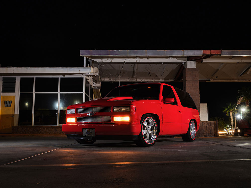 Now, the refresh that Mike is referring to mainly came in the form of a fresh Victory Red paintjob by the very talented Frank’s Customs in Lake Havasu, Arizona. When the Tahoe made its way into the Morris family, it looked pretty much exactly like it does now (it was even painted red before), which is kind of incredible when you stop to think about it. It’s still very much a time capsule of throwback style and aesthetic—right down to the very aftermarket components that were added to it back before Mike and his dad had ever laid eyes on it.
