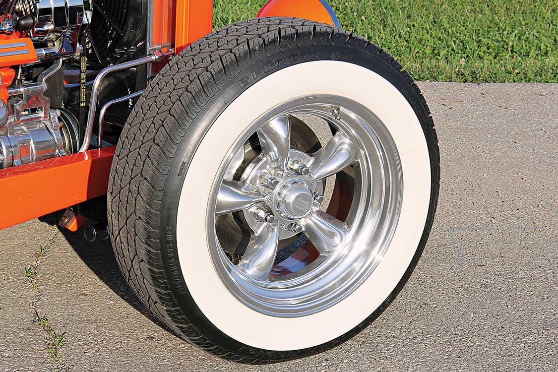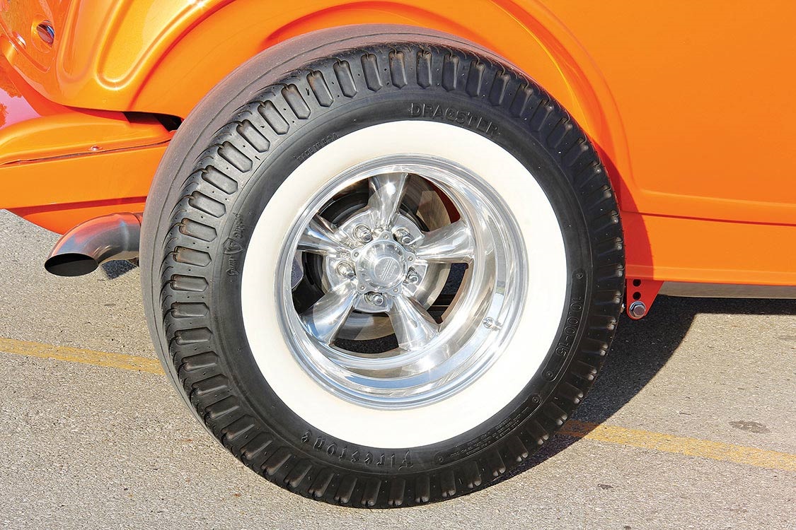 TIRES: Front: BF Goodrich P135/70-15 wide whites; rear: Coker Firestone Dragster Cheater Slicks wide whites 8.20-15