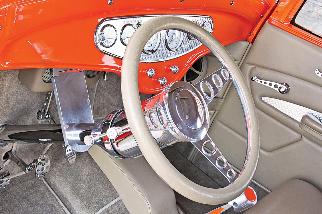 STEERING: ididit column with Billet Specialties Lakester 14-inch leather half-wrap wheel