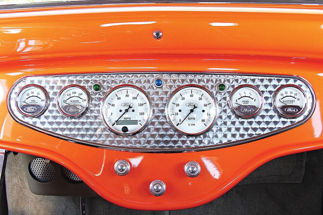 Not until he was in his early forties did his dream become a reality. Ron hooked up with Garret Kitchens, owner of Garret’s Rod Shop in Columbus, Ohio. The foundation of Ron’s dream rod was a TCI frame. The front suspension consists of TCI Mustang II upper and lower control arms with a pair of Carerra coil-over shocks. A second pair of Carerras suspends the Ford 9-inch rearend. To achieve traction and style, a set of 15-inch polished aluminum American Torque Thrust II wheels is consumed in BF Goodrich wide white rubber up front and Coker Firestone wide white cheater slicks out back. Bill Lemon machined and assembled the healthy Ford 460-ci engine equipped with a BDS 8-71 supercharger and a pair of Holley 700-cfm carburetors. Grabbin’ gears is done with a Tremec five-speed manual transmission. A New Age Motorsports 1932 Ford coupe body was mounted highboy style (above the frame rails). The frame, body and grille shell were painted by Chris Hayes using House of Kolor Tangelo Orange. The interior was cut and stitched by Mark Davis and Bob Mosher at Portage Trim.