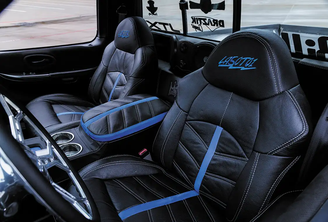 Stepping inside, the interior reflects Ruben’s impeccable taste, featuring custom upholstery and a bespoke center console. The sound system, powered by Alpine, ensures that you can hear Ruben’s arrival from blocks away.