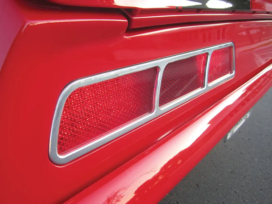 Staying with a GM color, the Torch Red paint with Tuxedo Black stripes were applied by Pat’s Custom Cars. After an extensive cut and buff, a custom billet grille was crafted protecting HID headlights. The lower splitter was color matched to the stripes. Marquez Billet taillights featuring Digi-tail sequential lighting were carefully secured. One of the more unique tricks of the Camaro build was the addition of Buick LaSabre power side mirrors.