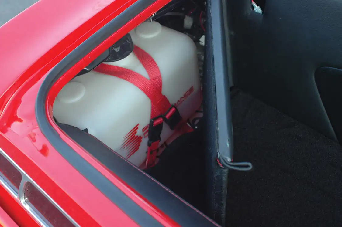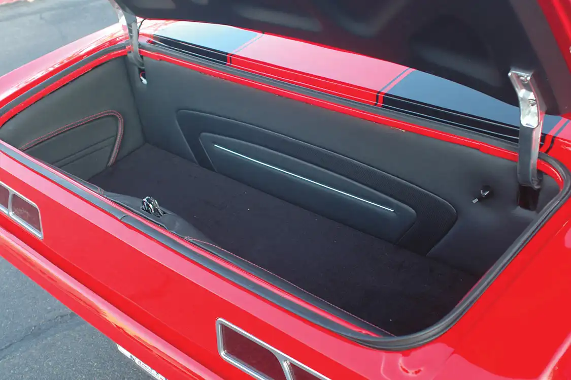 Completely hidden from view are the Pioneer audio components. All of the amps, crossovers and subs were installed in a compartment behind the rear seat and forward of the abbreviated trunk space. Armando’s was also tasked with creating the leather-covered trunk panels. Hidden compartments also conceal the Optima battery and methanol tank.