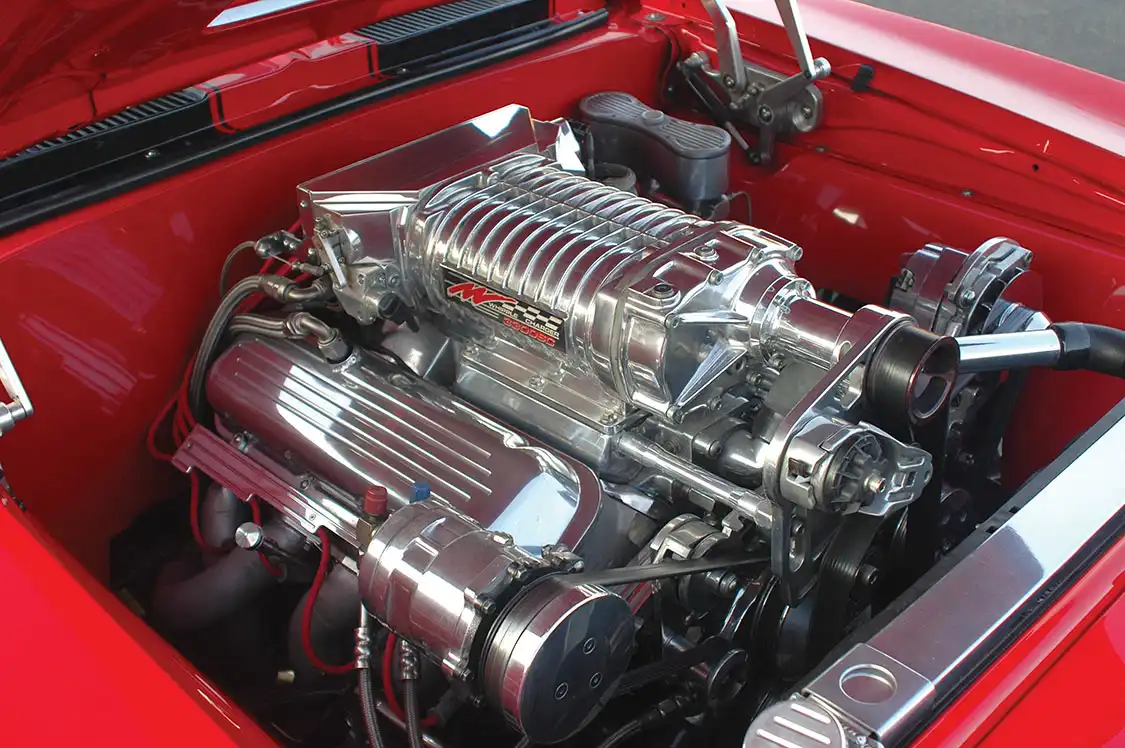 With the chassis ready to roll, Eric and Cindy had Greg Scott Racing Engines build a Dart 540 big-block. Brodix heads were bolted into place over TRW pistons. Billet Specialties valve covers and wire looms dress the heads. A Whipple-supercharged intake with 2,100-cfm throttle body was called upon to feed the need for speed. Spark is supplied via an MSD Pro- Billet HEI distributor.