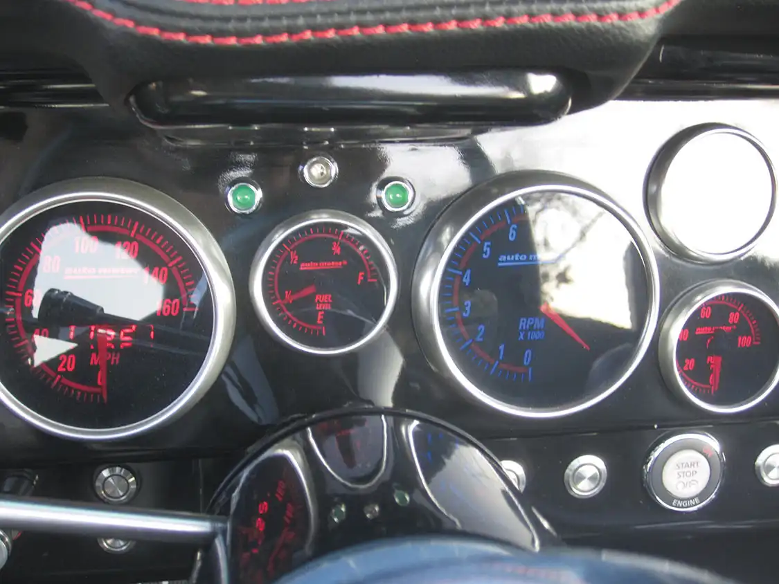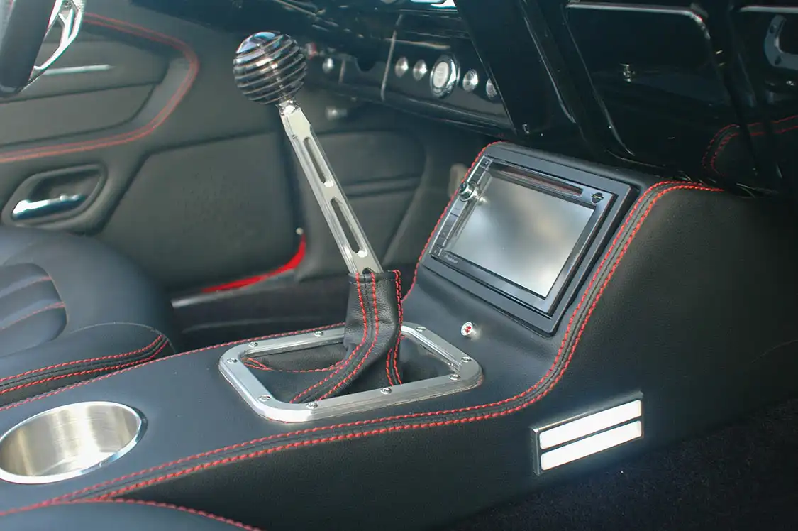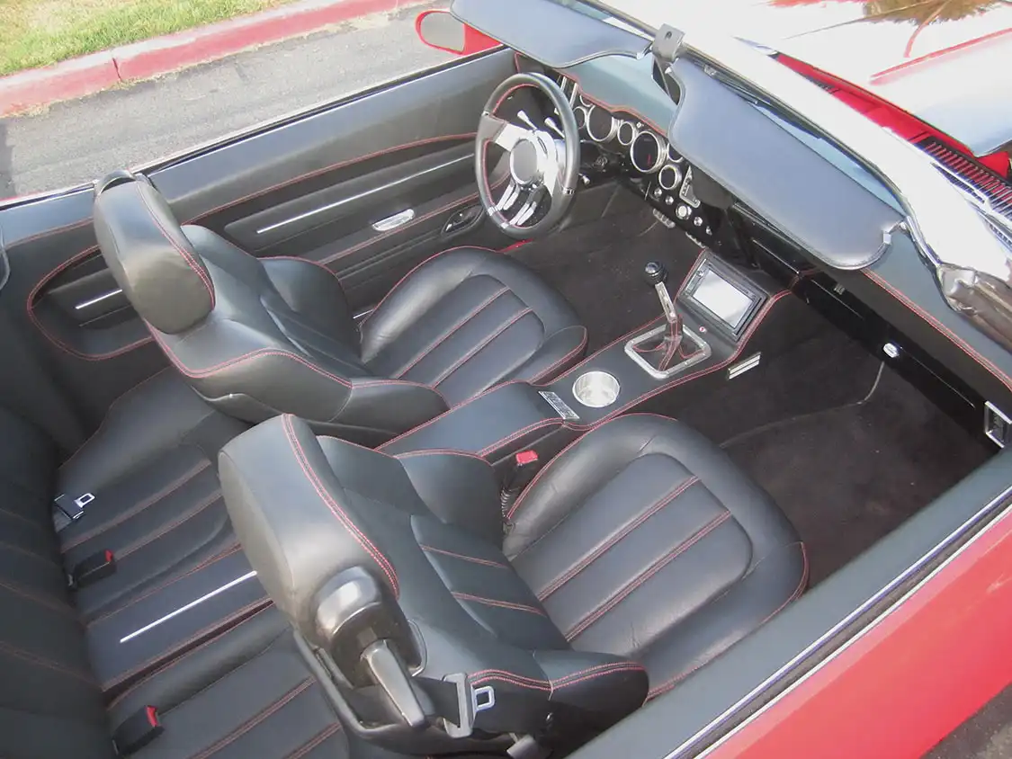 The interior was a blank canvas. The flat factory buckets were set aside for BMW M3 seats with integrated restraints. All of the stock gauges, audio and controls were gutted and saved for future projects, as was the steering column. For this ride the Detroit Speed dash was fitted with Auto Meter instrumentation, Vintage Air vents and a custom console with built-in navigational system. A Flaming River steering column and wheel were installed. The next stop was Armando’s in the Seniors’ hometown of Santee. It’s here where the black leather with red stitching was sewn up.