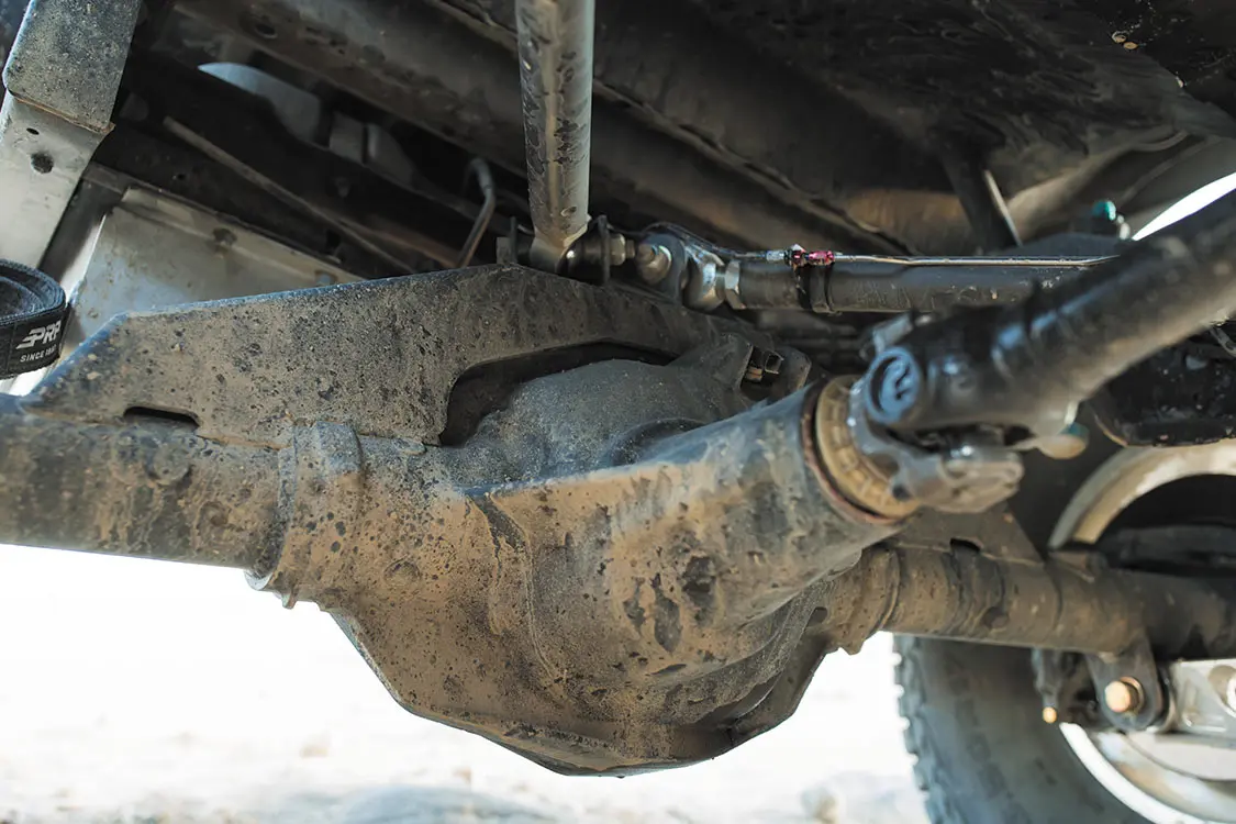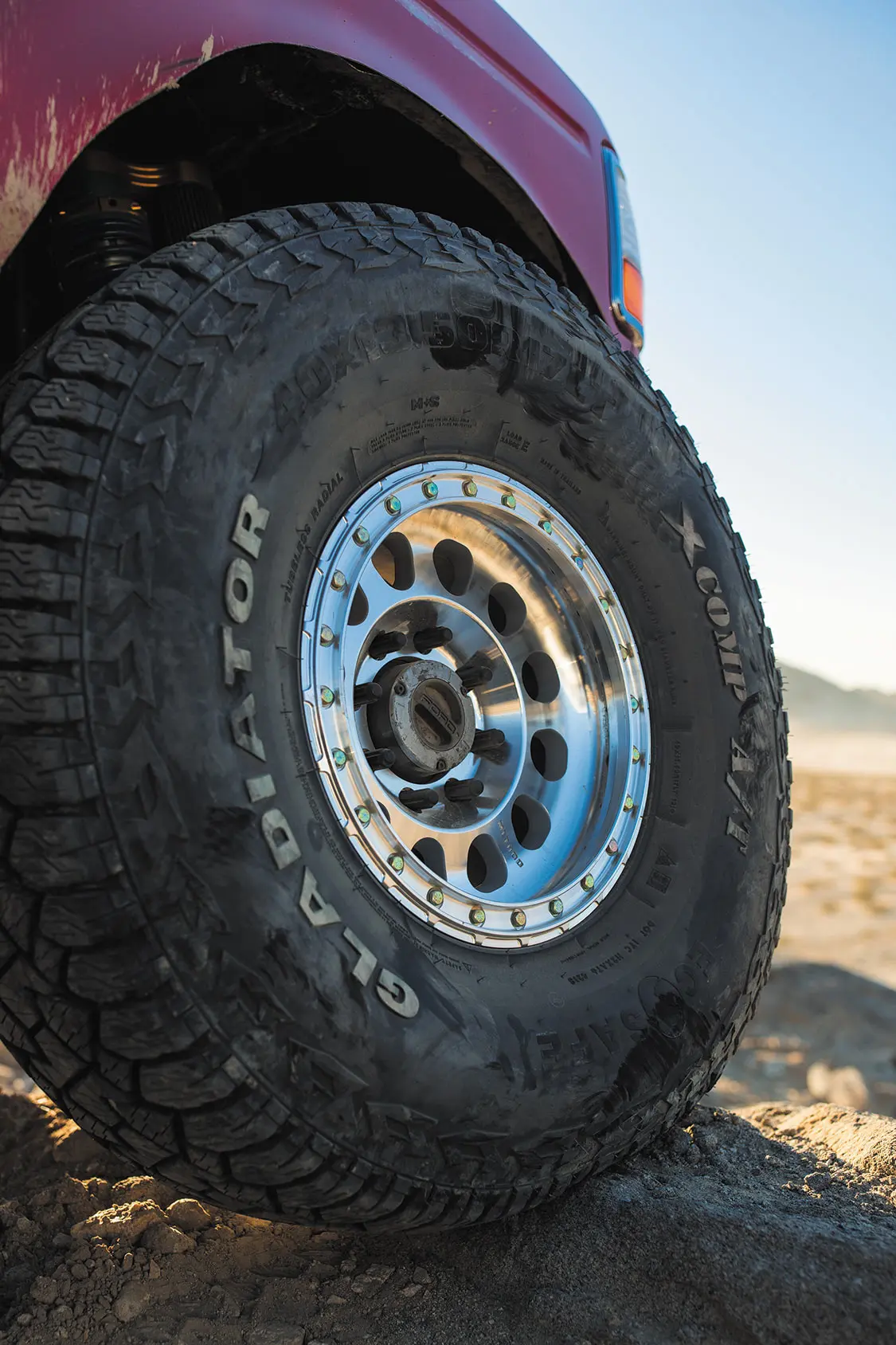 To get the suspension system dialed in to take on the rocks at King of the Hammers, he began by ordering a Desolate Motorsports solid front axle swap kit, a Quixotic Motorsports rear C-notch, rear 4-link and billet trailing arms, King Shocks 3.0 and 2.5 coilovers for the front and rear respectively, Eibach shocks along with all the parts and pieces to put it all together. Blake whipped up his own engine and transmission skid plates and opted for a plate from Desolate to protect the factory fuel tank. To help propel the Bronco through the rugged terrain, a set of Method Race Wheels 103s wrapped in X-Comp X/T tires were mounted and put into position.