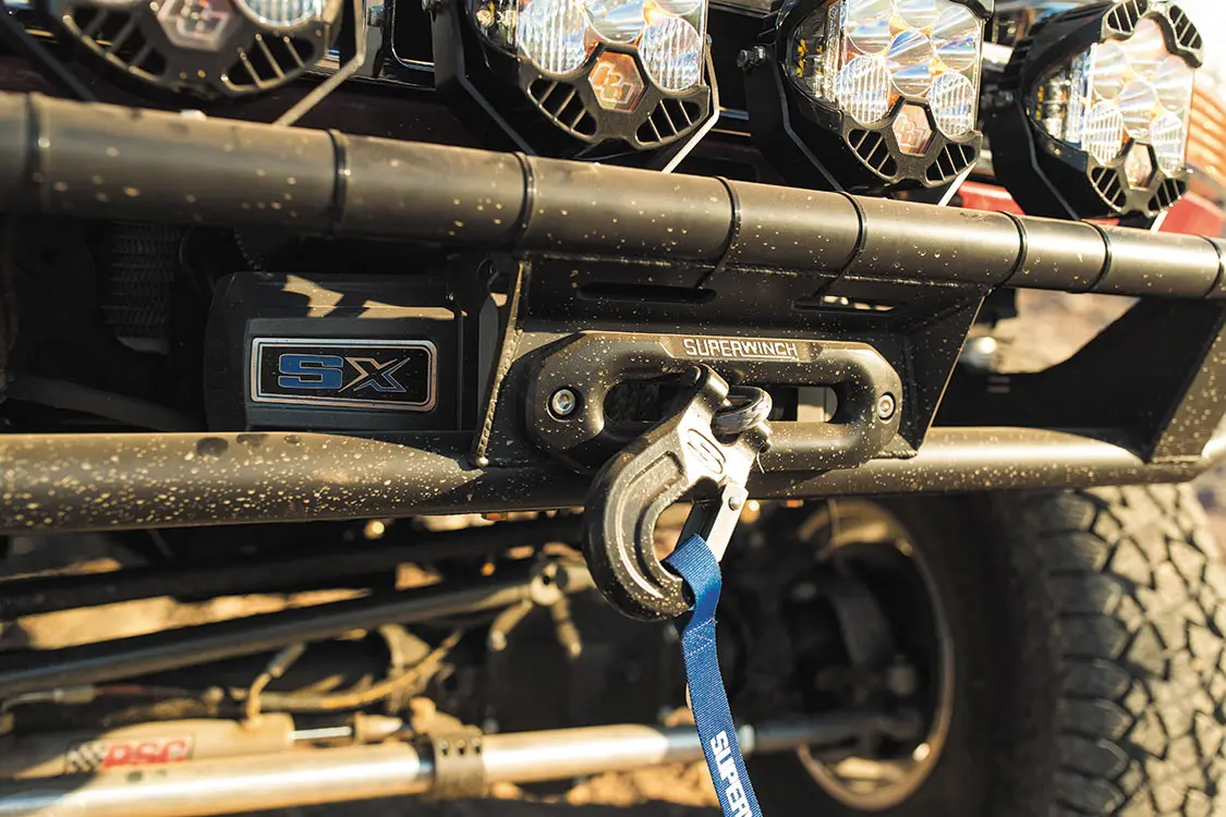 The Bronco’s exterior was also left largely alone save for the necessary armoring up with chromoly rock sliders and custom bumpers. A healthy dose of illumination was also added to the exterior with a row of front LED lights from Baja Designs, as well as two S2 Sport work lights sunk into the tailgate for increased rear visibility. To clear out enough fender space needed for full articulation of the wheels and tires, Blake reached for his trusty angle grinder and got to work. These OJ-era Broncos look great as-is without too many outwardly modification, and Blake has done his part to keep his looking as OG as possible.