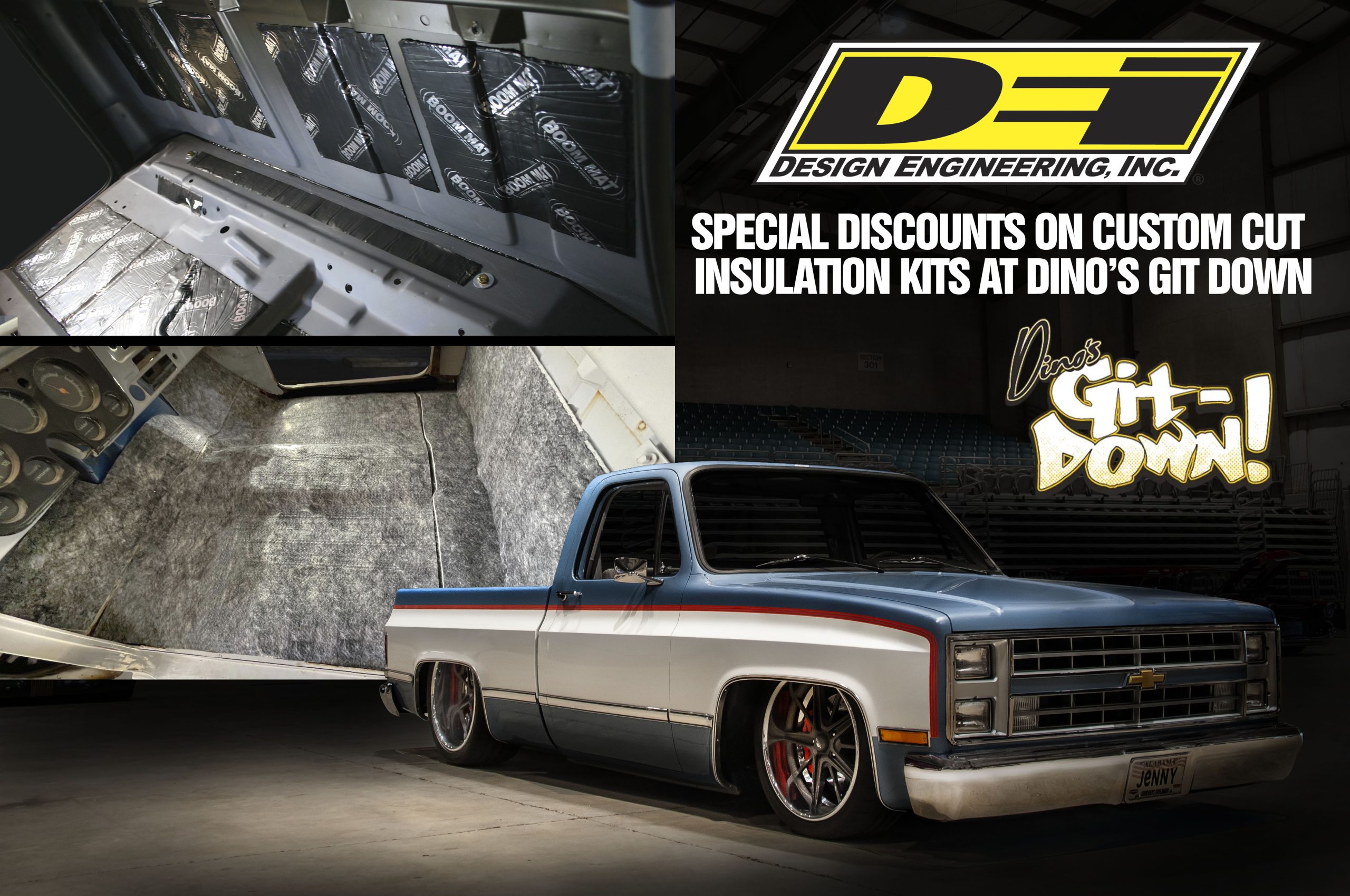 Coupon code offered for 20% off custom cut interior heat & sound control kit, and all DEI products during Dino’s Git Down. USE CODE GITDOWN20 at checkout.