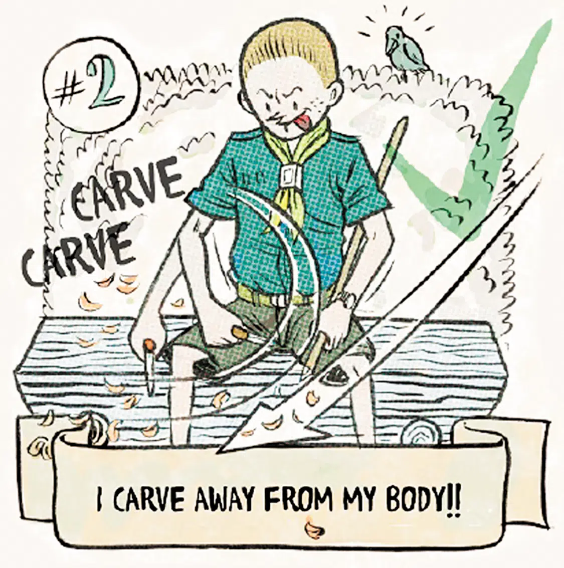 It’s very important that you are sitting down or kneeling when doing any carving or whittling. Both feet should be on the ground. The only exception would be when sawing something—here you could place a knee or a foot on something such as a tree stump and use it to stabilize the wood you are sawing while the other foot remains on the ground.