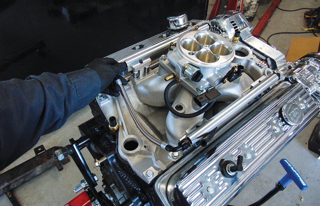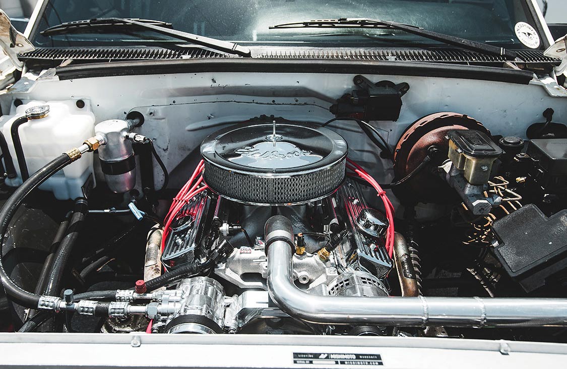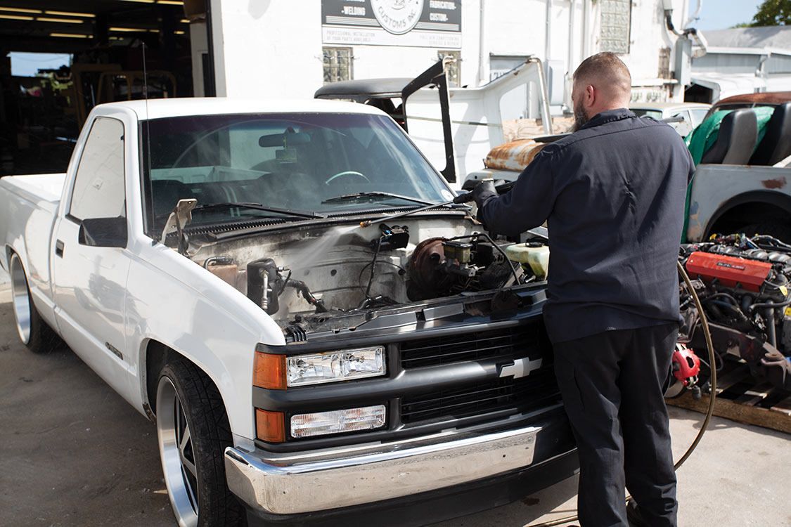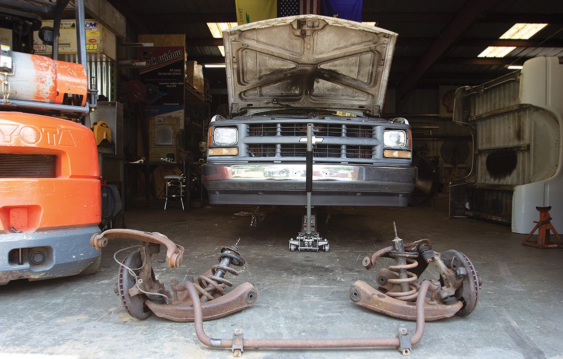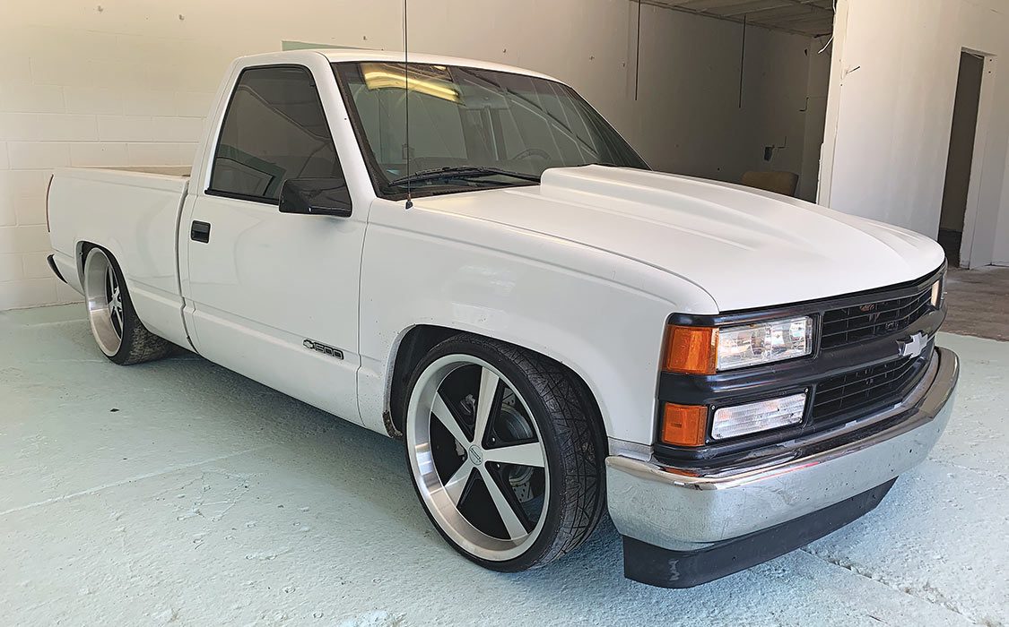 5a. Front HQ Series coilovers include bolt-on upper shock mounts to allow more ground clearance and maximum suspension travel, front upper and lower StrongArm tubular control arms, front and rear HQ Series coilover shocks, front sway bar and HD drop spindles.5b. Front HQ Series coilovers include bolt-on upper shock mounts to allow more ground clearance and maximum suspension travel, front upper and lower StrongArm tubular control arms, front and rear HQ Series coilover shocks, front sway bar and HD drop spindles.5c. Front HQ Series coilovers include bolt-on upper shock mounts to allow more ground clearance and maximum suspension travel, front upper and lower StrongArm tubular control arms, front and rear HQ Series coilover shocks, front sway bar and HD drop spindles.6a. This Pro Performance 14-inch front and 13-inch rear big brake kit is designed for ’88-’98 GM trucks and SUVs. This kit does not require machining to the axle or rotors, and the caliper has an integrated parking brake option. This brake kit will work with any disc brake drop spindle, such as McGaughy’s, Street Edge or Belltech. You will receive a template and instructions on modifying your spindle, which requires cutting of the caliper “ears” and drilling and tapping for the caliper mounting bracket. They look amazing behind our 22-inch American Racing wheels and Nitto Invo tires.6b. This Pro Performance 14-inch front and 13-inch rear big brake kit is designed for ’88-’98 GM trucks and SUVs. This kit does not require machining to the axle or rotors, and the caliper has an integrated parking brake option. This brake kit will work with any disc brake drop spindle, such as McGaughy’s, Street Edge or Belltech. You will receive a template and instructions on modifying your spindle, which requires cutting of the caliper “ears” and drilling and tapping for the caliper mounting bracket. They look amazing behind our 22-inch American Racing wheels and Nitto Invo tires.7a. Classic Industries offers this reproduction black plastic grille as well as the dual composite headlamps and corner lights that are all designed to replace the original. This conversion is as simple as unbolting the original grille and headlights and swapping in the new stuff. To swap the headlight plugs, we turned to MrTailLight.com for the kit. The company offers the new headlight plugs and all the mounting hardware you need to take the guesswork out of the process. We can’t convey how simple this process is and it’s very affordable.7b. Classic Industries offers this reproduction black plastic grille as well as the dual composite headlamps and corner lights that are all designed to replace the original. This conversion is as simple as unbolting the original grille and headlights and swapping in the new stuff. To swap the headlight plugs, we turned to MrTailLight.com for the kit. The company offers the new headlight plugs and all the mounting hardware you need to take the guesswork out of the process. We can’t convey how simple this process is and it’s very affordable.8. Now to focus on the engine swap. The factory 4.3-liter V-6 has got to go, but since this is a perfectly running engine and transmission, we will save it for a quick flip project. The crew at Overpower Customs yanks engines on the daily so ripping this one out is child’s play. Jason and Trey removed all the plugs and bolts before hooking it up to a forklift. Replacing it will be a new BluePrint Engines 383ci Stroker motor paired up to a Centerforce clutch in our American Powertrain transmission.9. Now to focus on the engine swap. The factory 4.3-liter V-6 has got to go, but since this is a perfectly running engine and transmission, we will save it for a quick flip project. The crew at Overpower Customs yanks engines on the daily so ripping this one out is child’s play. Jason and Trey removed all the plugs and bolts before hooking it up to a forklift. Replacing it will be a new BluePrint Engines 383ci Stroker motor paired up to a Centerforce clutch in our American Powertrain transmission.10. Before the new engine can go in, Trey pressure cleaned the engine bay to remove all the old grease and grime. The core of this truck is in great shape!11a. Our BluePrint Engines 383ci Stroker engine comes turnkey other than the drive pulleys. So, before they bolt up the new 5-speed American Powertrain transmission, a Vintage Air Front Runner drive pulley kit goes in. The completed kit looks amazing! It is nice and tight to the block, so we don’t have to worry about fitment when installing the engine. Also, the Bright finish gives its the quality look they deserve.11b. Our BluePrint Engines 383ci Stroker engine comes turnkey other than the drive pulleys. So, before they bolt up the new 5-speed American Powertrain transmission, a Vintage Air Front Runner drive pulley kit goes in. The completed kit looks amazing! It is nice and tight to the block, so we don’t have to worry about fitment when installing the engine. Also, the Bright finish gives its the quality look they deserve.12a. To control our fuel delivery system, we chose to go with Edelbrock’s new Pro-Flo 4 electronic fuel injection. The Pro-Flo 4 is not just a replacement for your carburetor. It’s a complete engineered system that provides the ultimate in performance, drivability and quality. This will result in a smoother idle, faster acceleration, better peak power, improved fuel economy and the ability to control detonation, all in the E-Tuner 4 app. The key to the improved performance is the fuel injector location, which is at the end of the runner on the intake manifold right before the airflow stream enters the combustion chamber. This location provides a more efficient mixture control that’s unaffected by varying intake manifold runner temperatures and length.12b. To control our fuel delivery system, we chose to go with Edelbrock’s new Pro-Flo 4 electronic fuel injection. The Pro-Flo 4 is not just a replacem