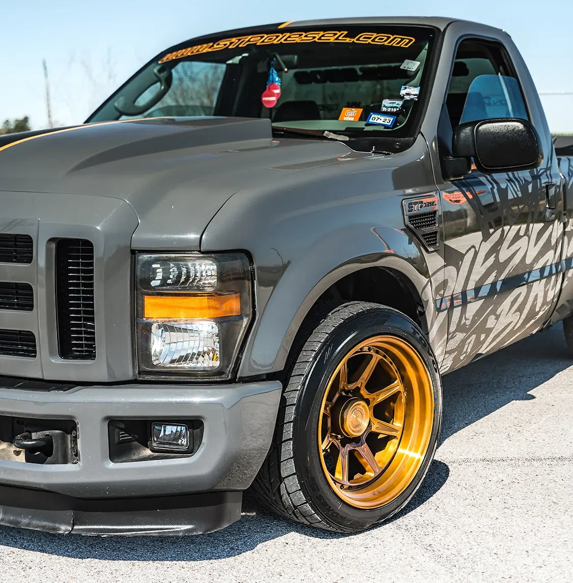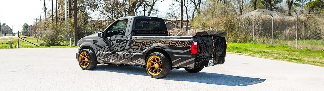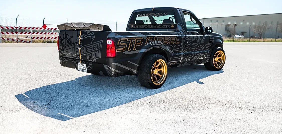 Another aspect of the F-250 that captures loads of attention is its outer façade. The combination of fresh paint and strategic vinyl wrapping adds a dramatic dose of killer graphics that feature STP Diesel and Diesel Bros branding. A dividing line down the center of the truck breaks up the inverted black/gray color schemes that are unique on each side. A 2008 F-250 front end conversion has updated the forward appearance of the Ford, and a rear spoiler from K Designs gives the posterior additional sporty appeal.