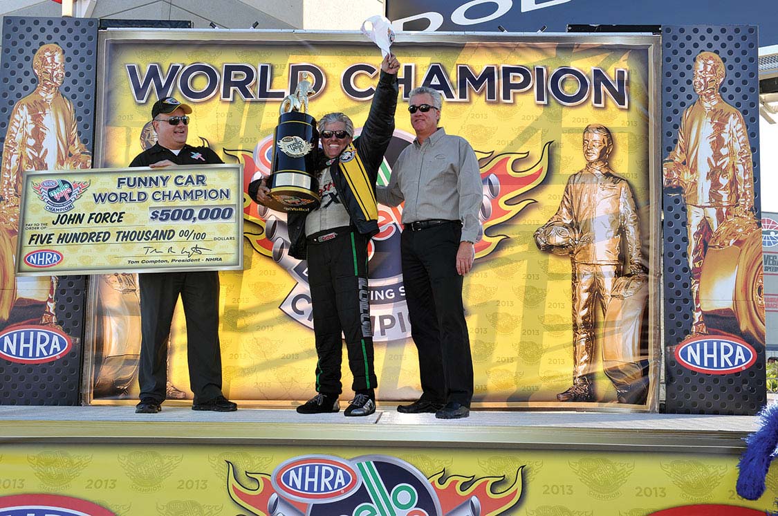 After years of frustration, Force won his first NHRA national event in 1987. From there his career rocketed. The current national event Wally count is 138, making Force the winningest driver in NHRA history and its only pro driver with more than 1,000 round wins. This translates into a record 28 consecutive Top 10 finishes. The first Force World Championship came in 1990 and again in ’91. Then he reeled off an amazing 10 straight from ’93 through 2002, repeating in ’04, ’06 and now 2013. Yes, 16 NHRA Funny Car World Championships!