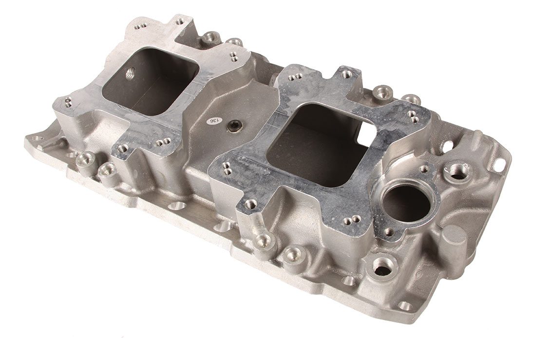 The Speedmaster low-profile design and highflow runner intake manifold accommodates two 4-barrel carburetors. This achieves the best balance of driveability, looks, and superior performance for muscle cars, street rods and marine apps.
