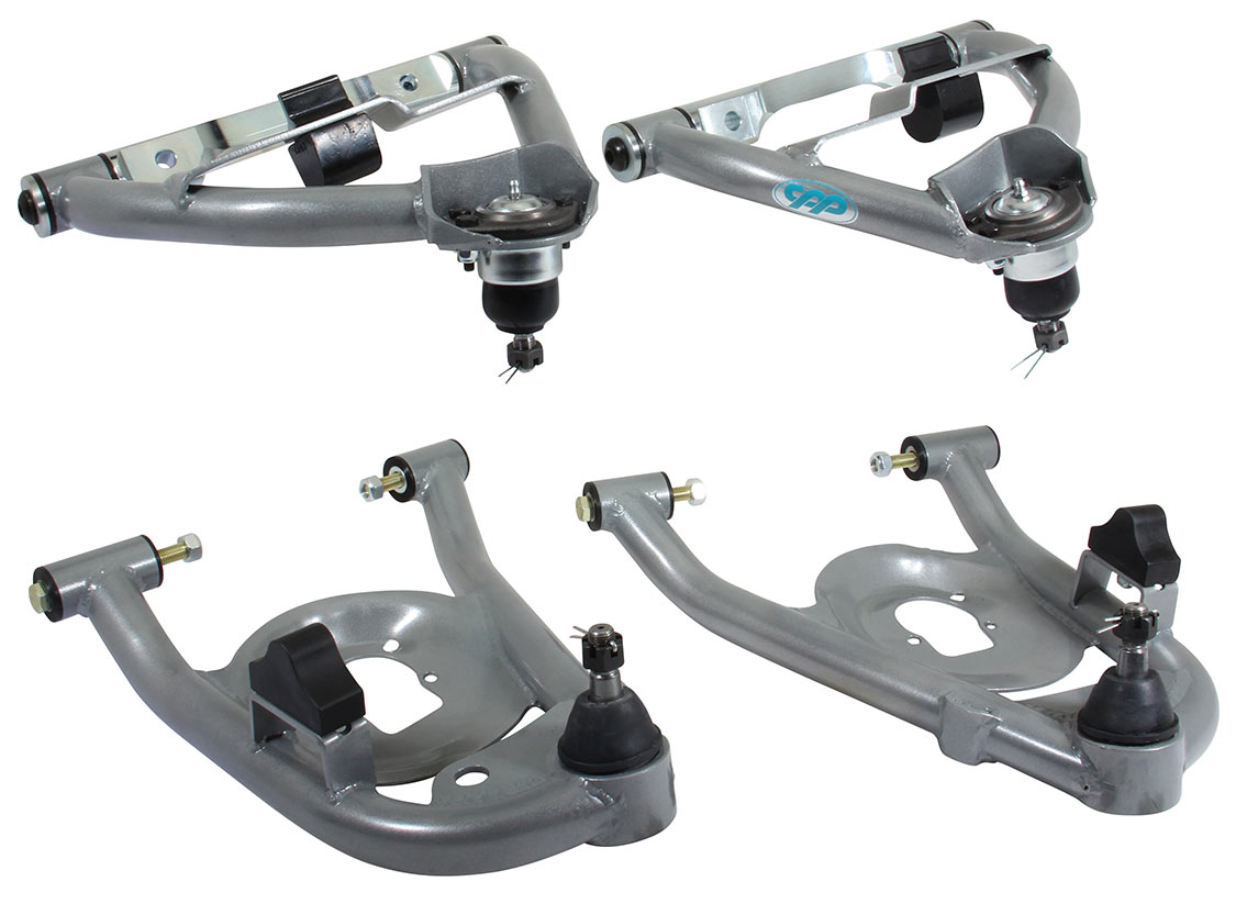 Upper arms with custom billet cross shafts preassembled and custom pivot sleeves, have a safety feature that captures both sides of the bushing, unlike the originals that were only retained on the one side of the bushing under the head of the bolt. This unique feature allows full control and virtually no flex on the control arm when cornering. The lower control arms have a helical stamped coil spring mount, just like they did from the factory, which secures the coil spring into the lower control arm. The coil mount has been improved to make installation even easier. The lower shock mount is incorporated into the stamped coil plate and will also accept many aftermarket suspension systems as well.