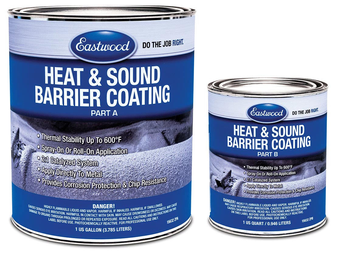 Eastwood’s Heat & Sound Barrier Coating provides a significant reduction in road or engine noise and transmission of driveline vibrations. It also helps keep heat from penetrating the vehicle’s interior, drastically increasing the comfort level. The product is a 2-part catalyzed coating which deadens sound up to 5 decibels and reduces heat up to 40F. This product is as easy as applying paint—spray on or roll on application. It inhibits corrosion on bare metal, so no primer is needed. It’s perfect for applying to floors, firewalls, and other hard to reach areas inside or on the underside of vehicles.