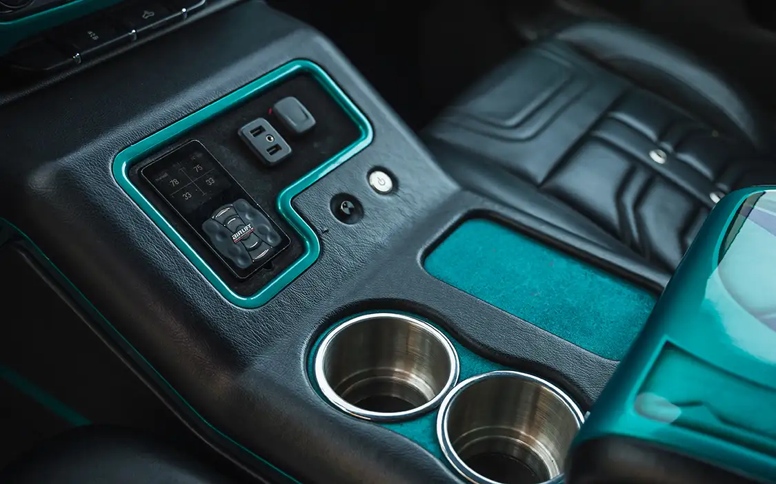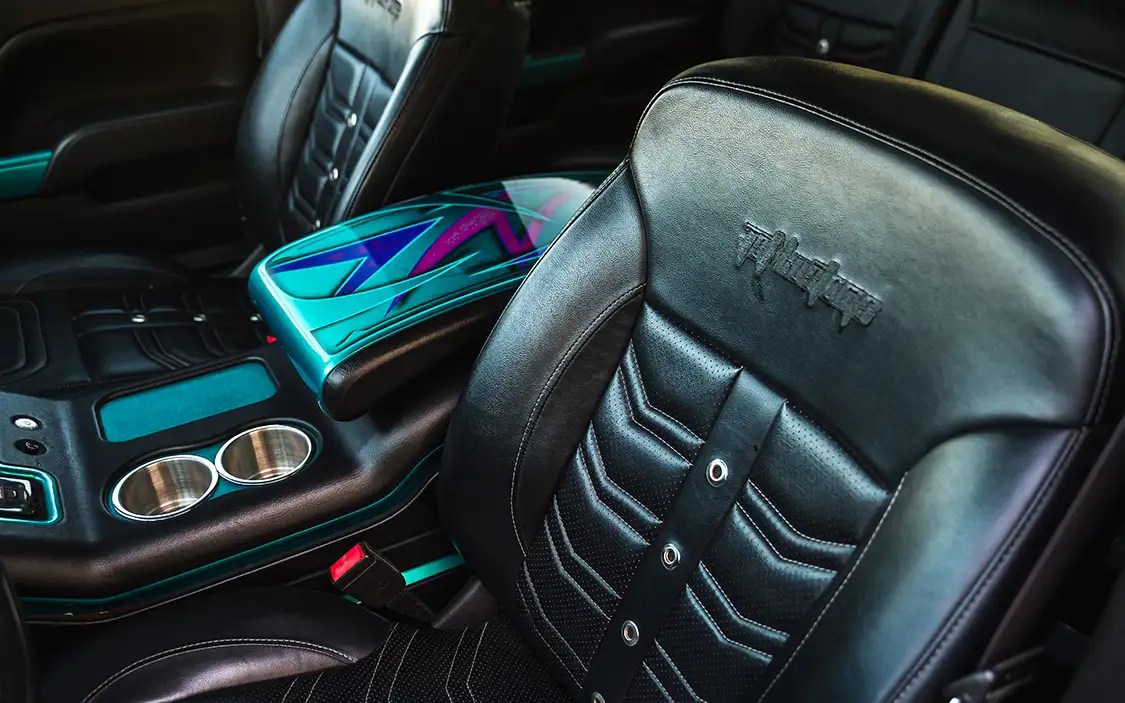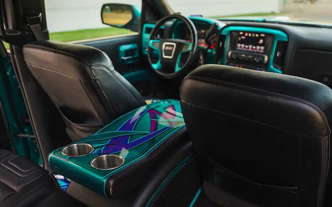 Under the hood, the Sierra retains its reliable 5.3L V-8, paired with a 6-speed automatic transmission. While performance upgrades are minimal, the truck’s primary focus is on aesthetics and ride quality. The interior, however, saw a full overhaul with black leather upholstery, color-matched interior trim pieces, and a custom-built center console featuring matching graphics.