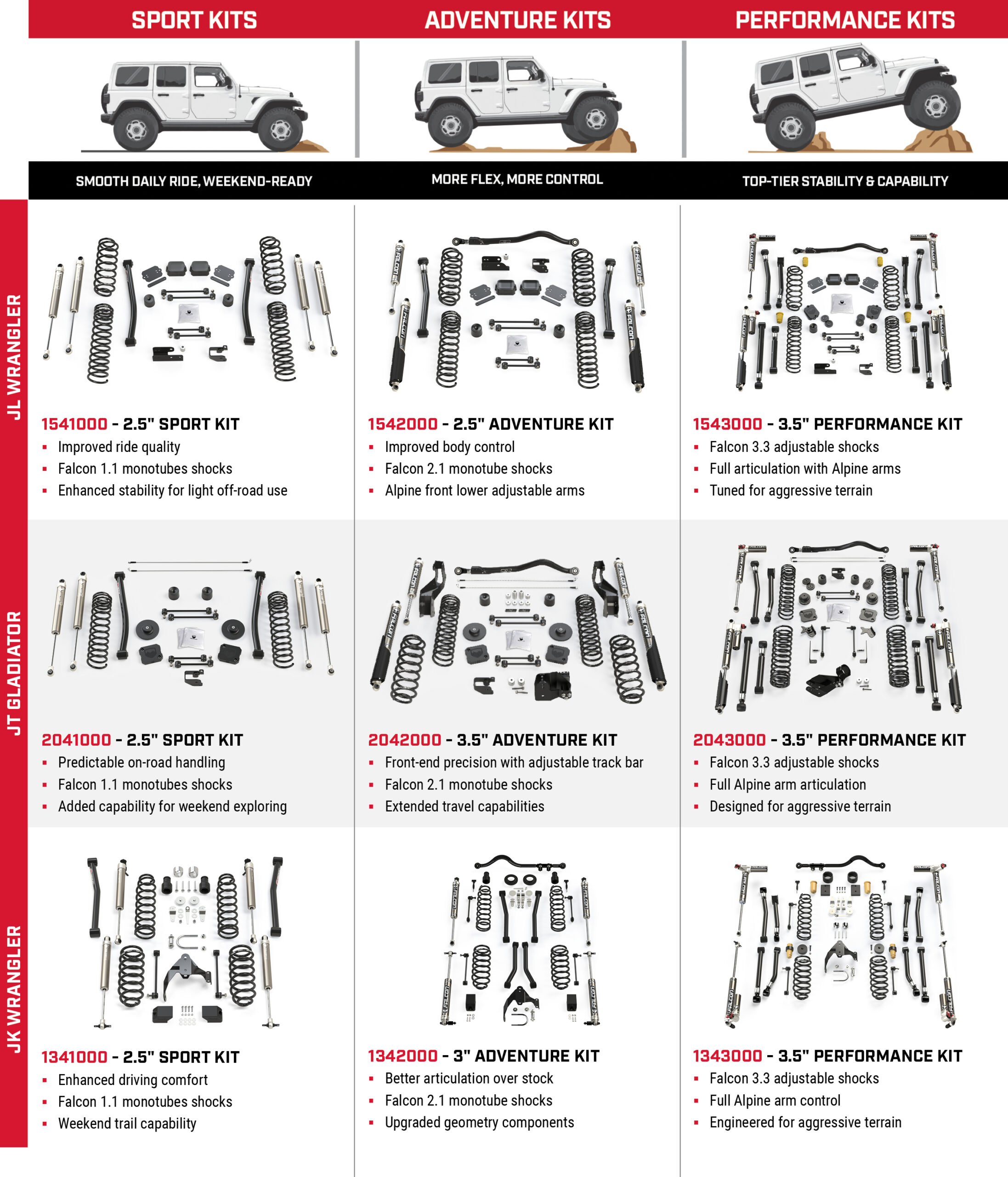 TeraFlex just launched the Trail Select Series. It’s a Good/Better/Best suspension options for Jeep JK, JL, & JT. They took the best combos of premium TeraFlex and Falcon components to create an easy selection process for your everyday Jeep owner. The kits are highlighted on their website here: https://teraflex.com/blog/teraflex-all-new-trail-select-series-suspension-systems/