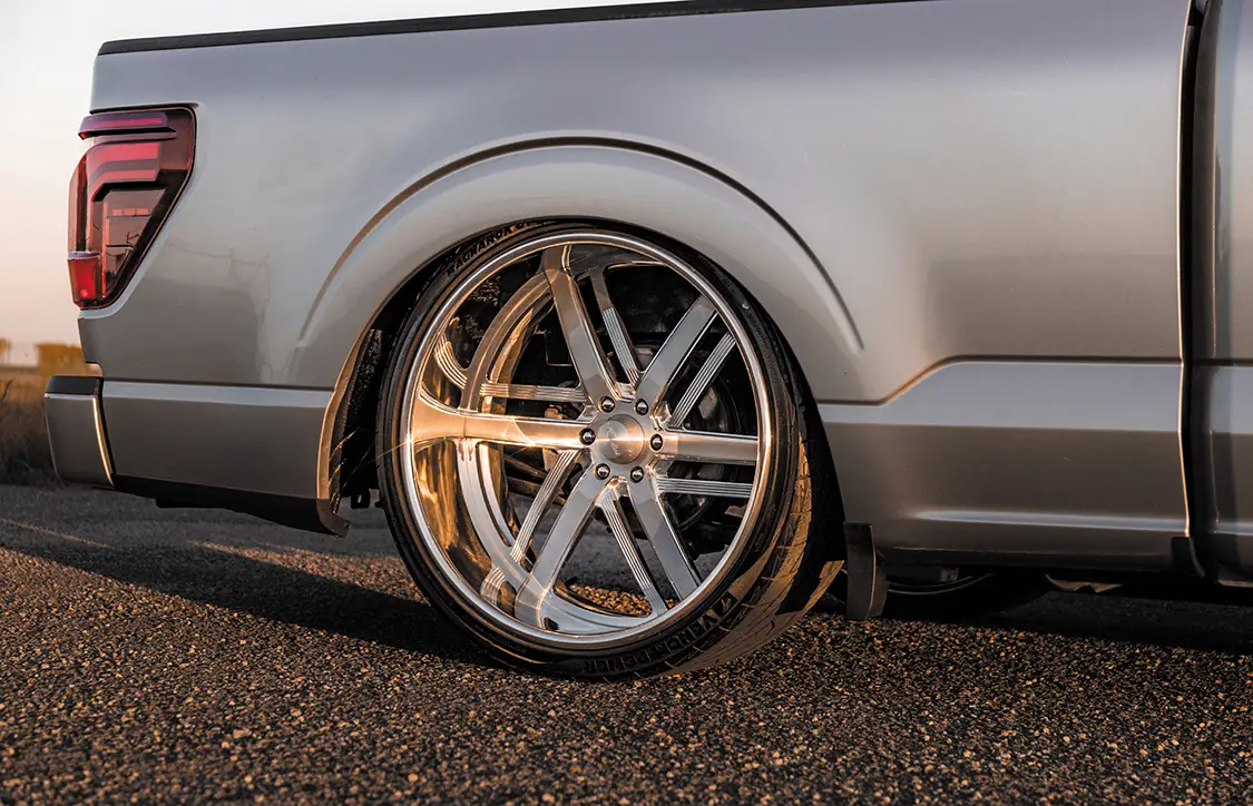 Of course, the soul of any RGV truck is its stance. For that, the chassis was delivered into the trusted hands of TJ Customz in Mission, Texas. They didn’t just install a kit; they engineered a custom IHC Suspension setup that allows the frame to lie just millimeters from the ground when parked, all while maintaining a respectable ride. To complete that iconic “Valley look,” a set of mirror-polished, staggered Raceline Sidewinder wheels—24x9s in front and deep reverse-lipped 24x10s in the rear—were wrapped in stretched rubber and tucked deep into the fenders.