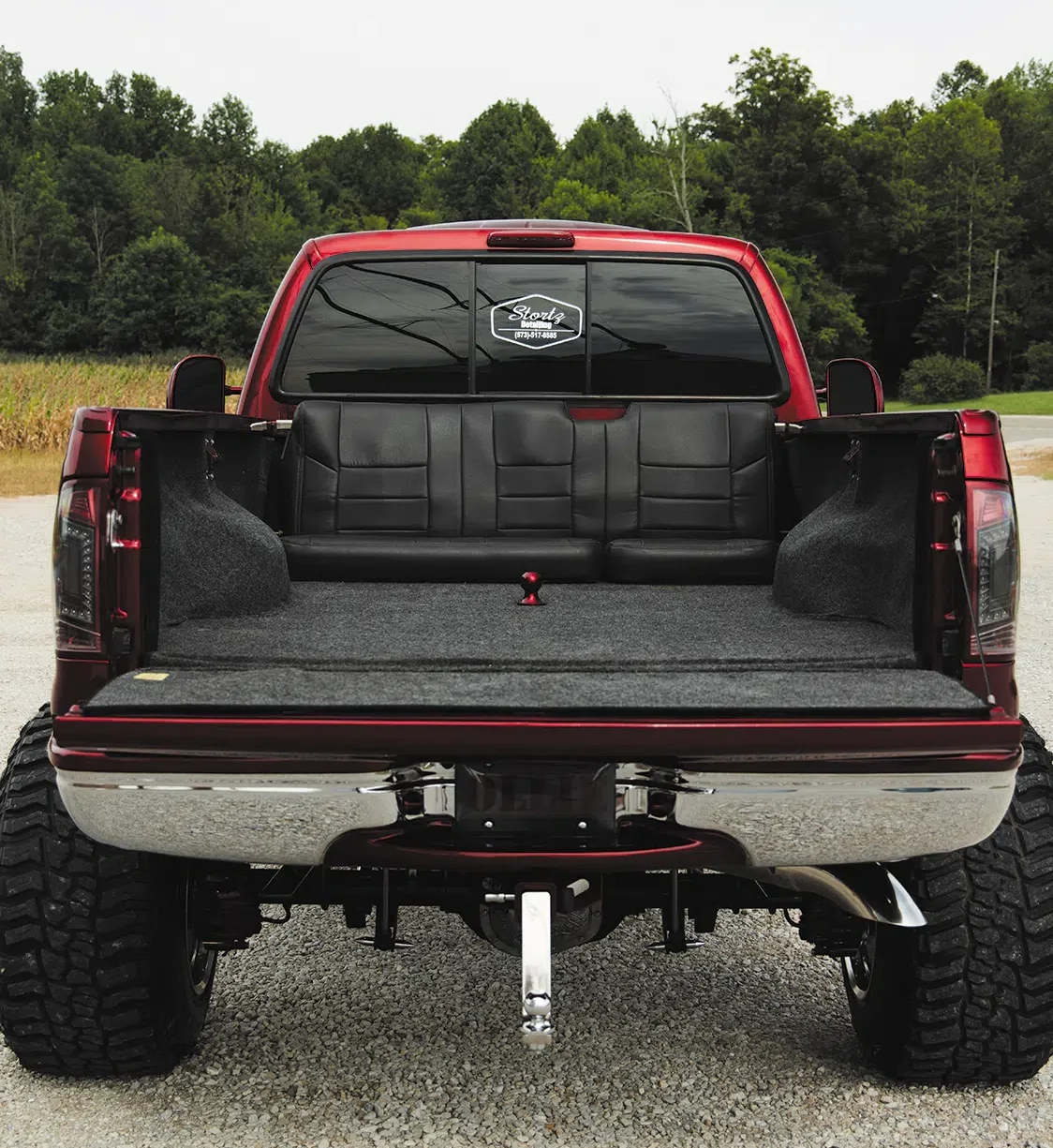 While most might see the paint color as being merely red, the specific shade that was selected is called Razzle Berry, which really has turned into the truck’s newfound persona. The elevated candy color has been strategically used inside of the headlight and taillight housings, as well as peppered throughout the engine bay and underneath the truck. Even the AMP Research running boards have been powdercoated to match. Royalty Core grille inserts give the front end an updated twist, and at the rear, the inside of the bed has been outfitted with a full carpet kit as well as a bench seat to make cruising around with friends a much more enjoyable experience.