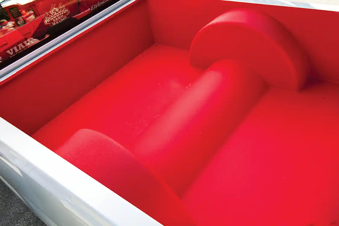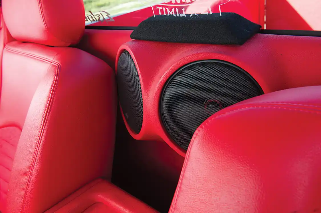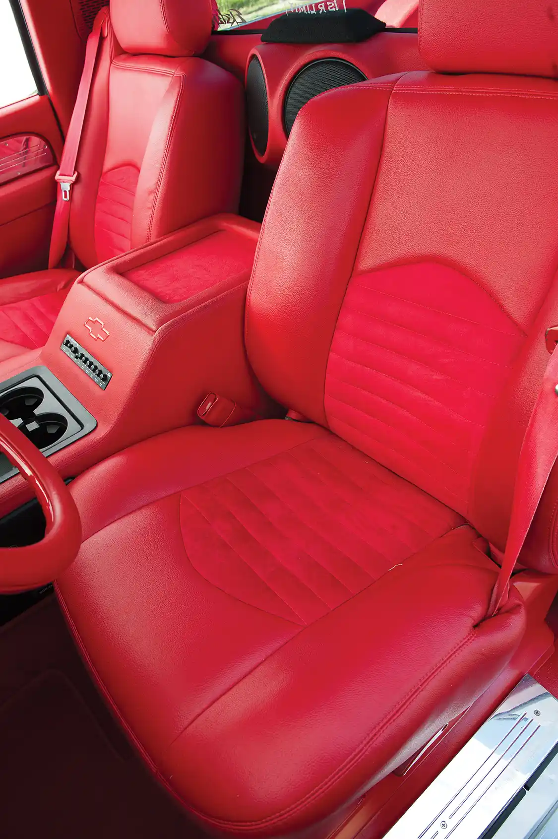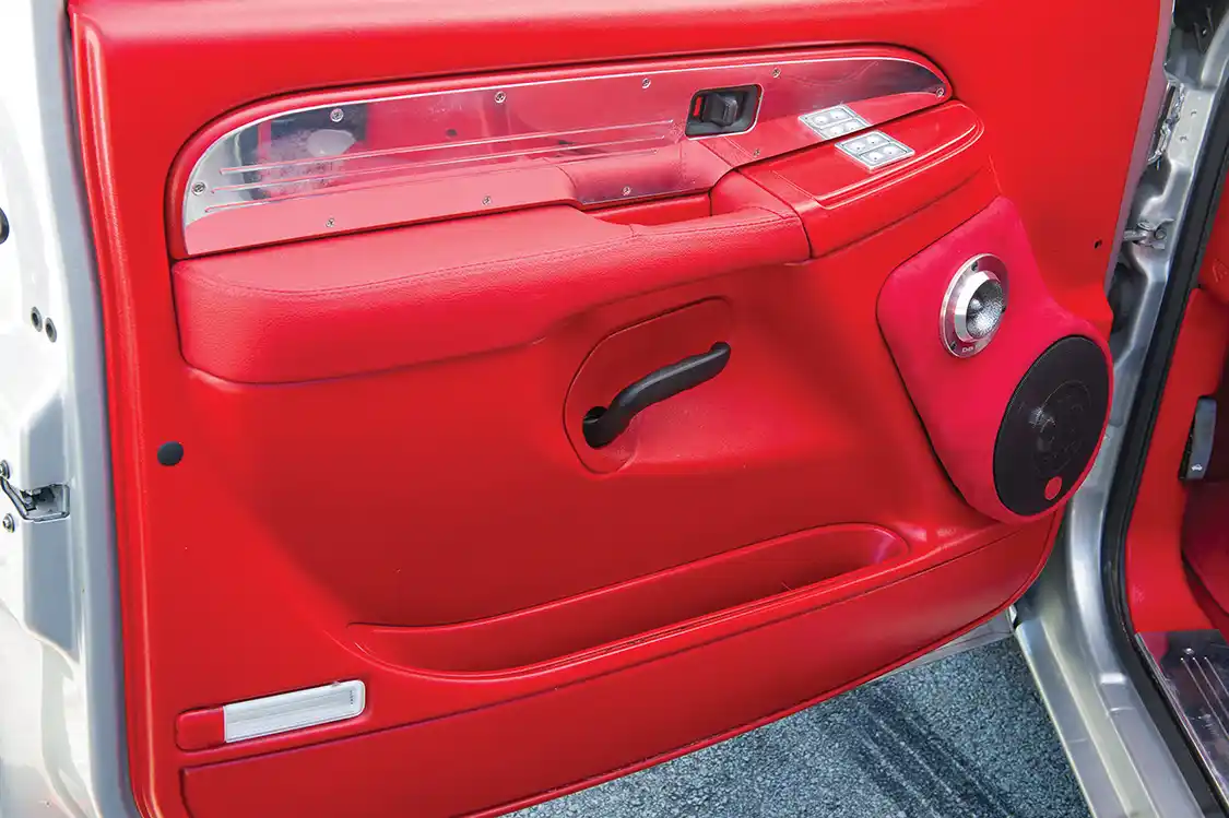 Julio was happy having a truck that was really fast and really low, but the stock paint didn’t seem as shiny as it once did, and the snowball effect once again took over. “I was like, I need a paint job, so then the truck looked really good—too good to have a stock interior.” Before long, Julio had a full show truck on his hands, with Ford Platinum paint and a wild custom interior, which was done up in red from top to bottom.