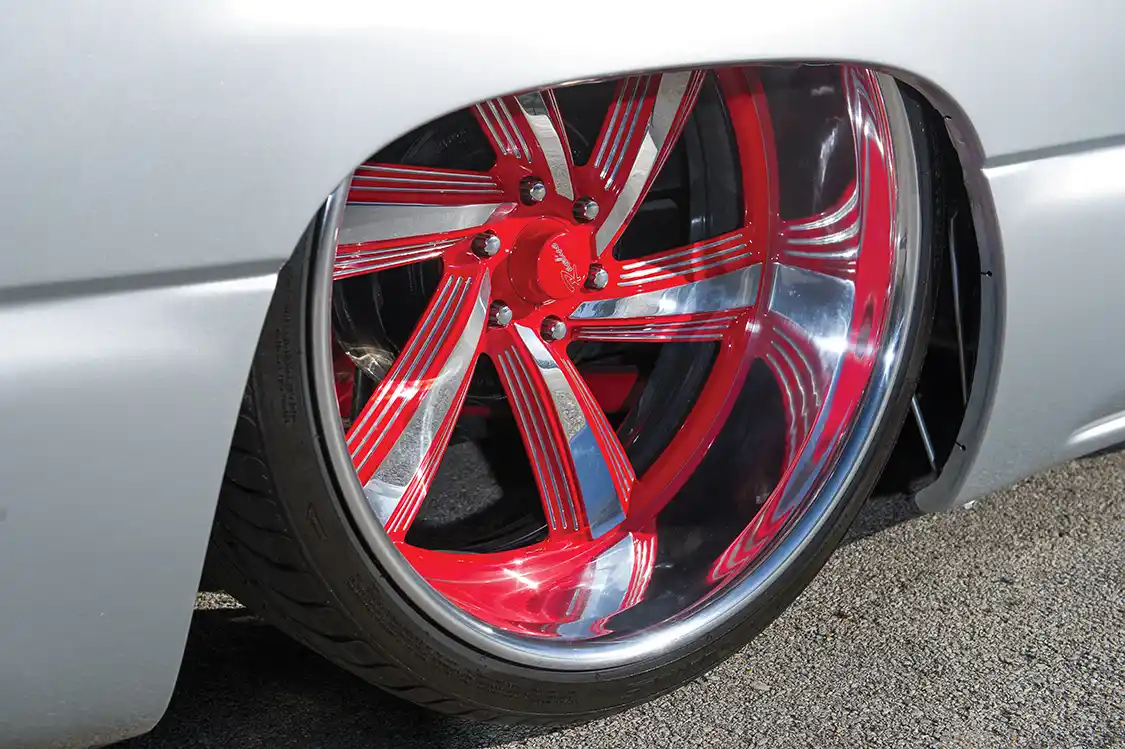 The problem was, after Julio did all that, it seemed like no one was interested in racing him anymore, which was probably a smart move on everyone’s part. Still, what fun is a race truck when no one wants to race? So, Julio decided to throw some more street style into the mix in the form of 24- and 26-inch staggered Raceline Explosion 6 wheels. But that made the truck look too high with the low-profile tires, so he had Shorty’s Customs introduce the frame to the ground using an Ekstensive ’bag kit. We’re happy to report that the two have been nearly inseparable ever since.
