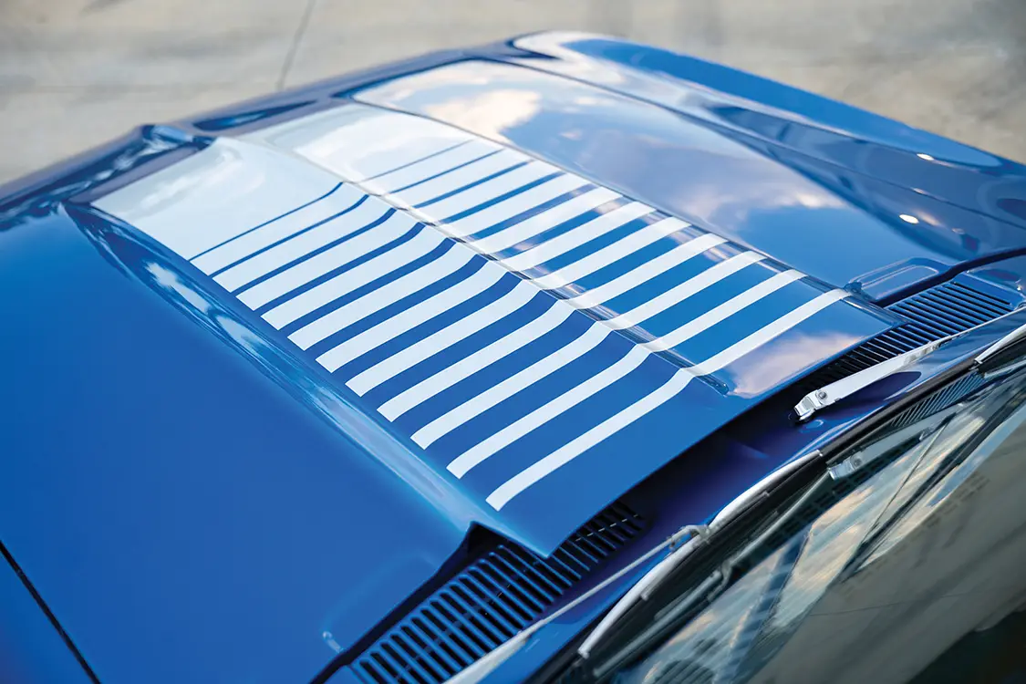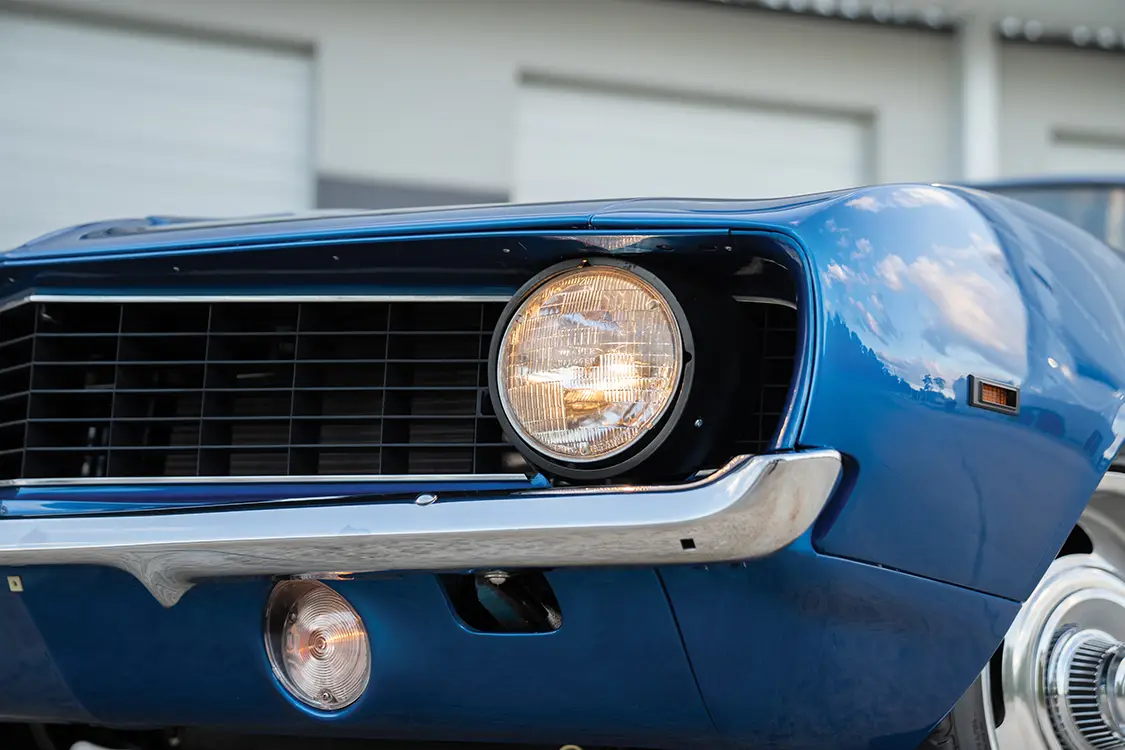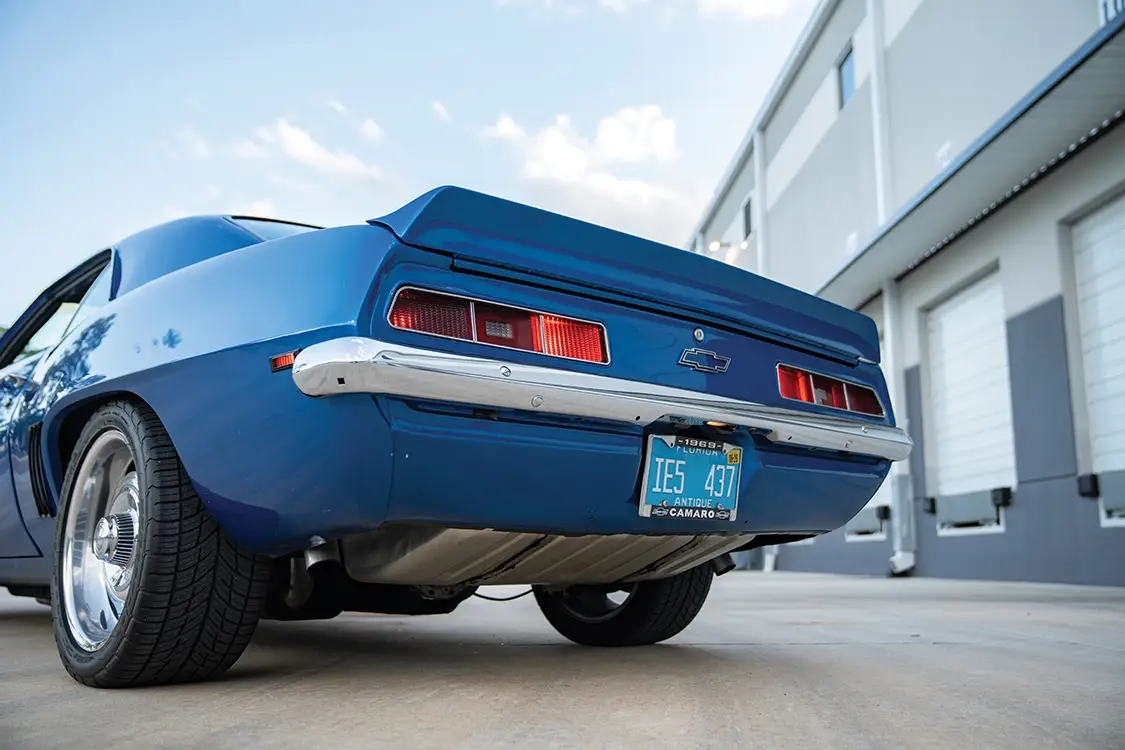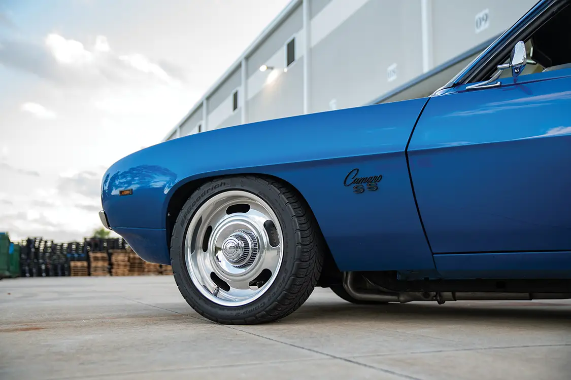 The exterior is pure 1969 at first glance. Stock bumpers and grilles maintain the factory silhouette, while the Laguna Blue paint, laid down with a custom Jerry-designed hood stripe, provides the signature pop. Beneath that classic skin sits a GM 383 stroker crate engine, balanced and blueprinted by Wheeler Motorsports in Jacksonville, Florida. A Comp Cams bumpstick with .547 lift and 288 degrees of advertised duration, a custom intake, and a Holley Street Avenger 670-cfm carburetor feed the small-block. Hooker 3-inch headers flow into a full custom exhaust, while an MSD 6AL digital box and a Radiator Technologies four-row aluminum core with dual electric fans keep everything cool and ignited.