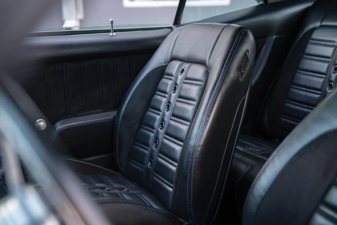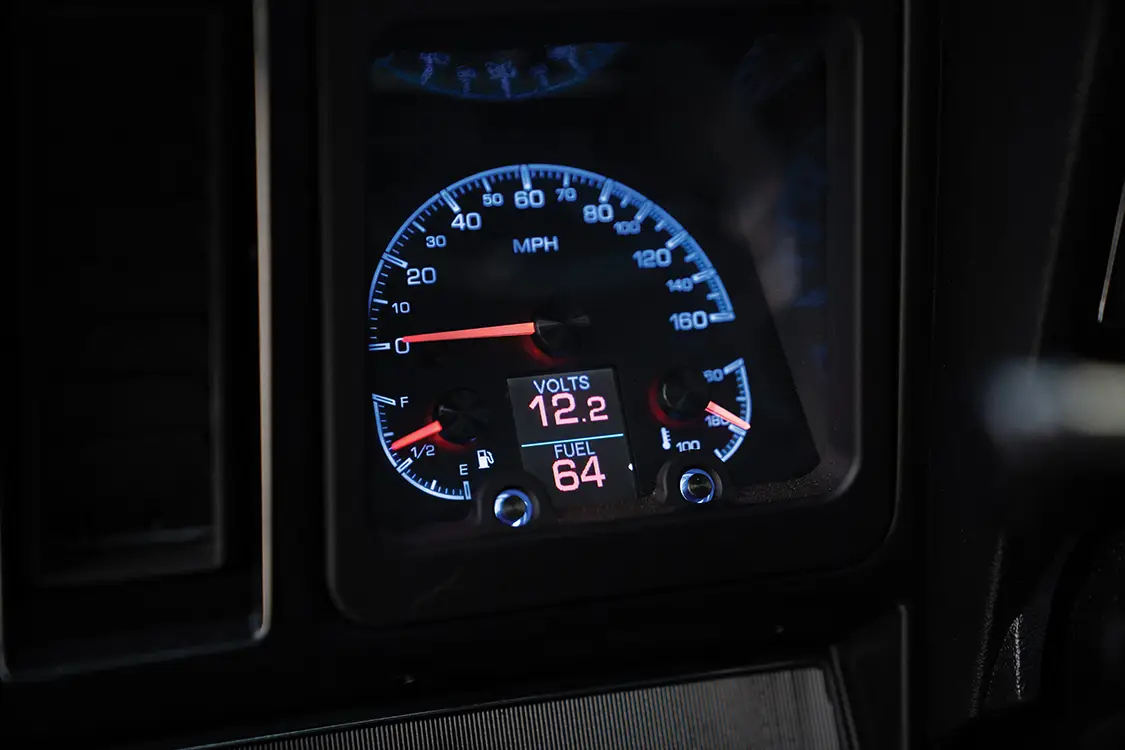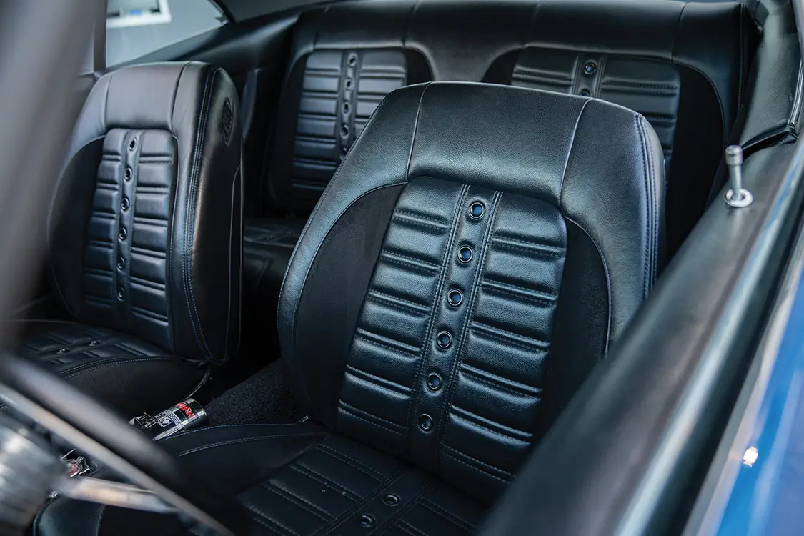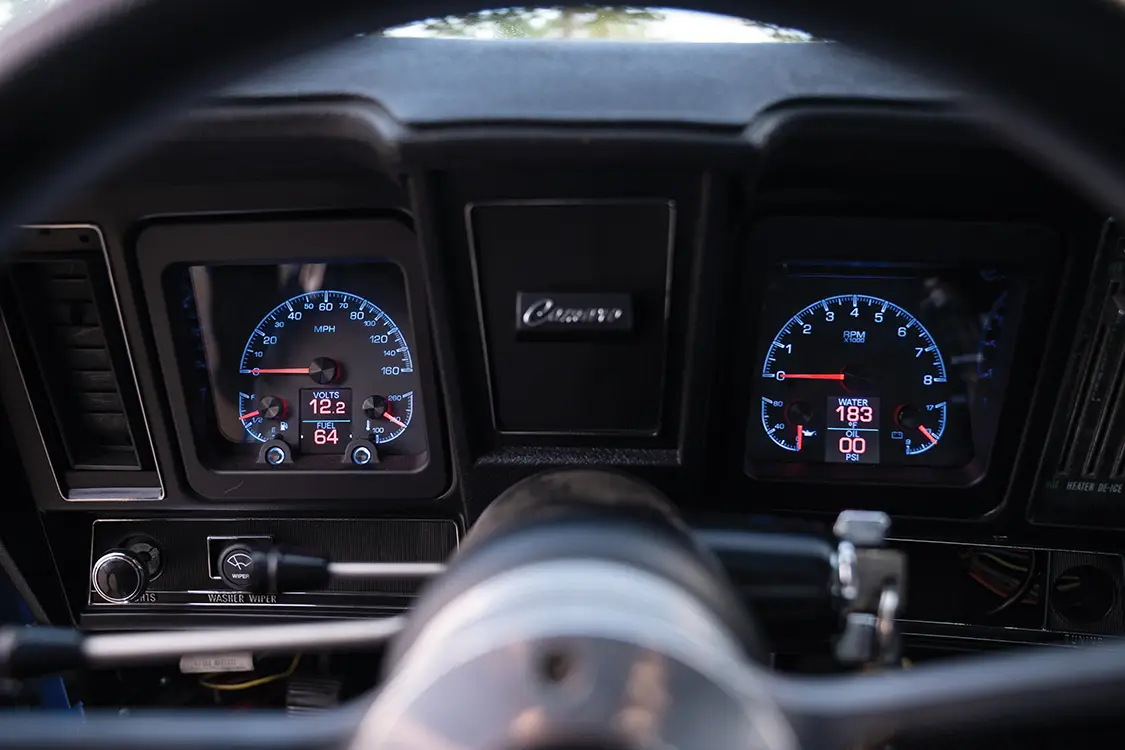 Inside, TMI Sport-VXR seats with black-and-blue stitching, installed by Shoupe and Son Upholstery in Ocala, anchor a cockpit finished with Dakota Digital VHX gauges, an Ididit tilt column, and a 14-inch billet wheel wrapped in black leather.