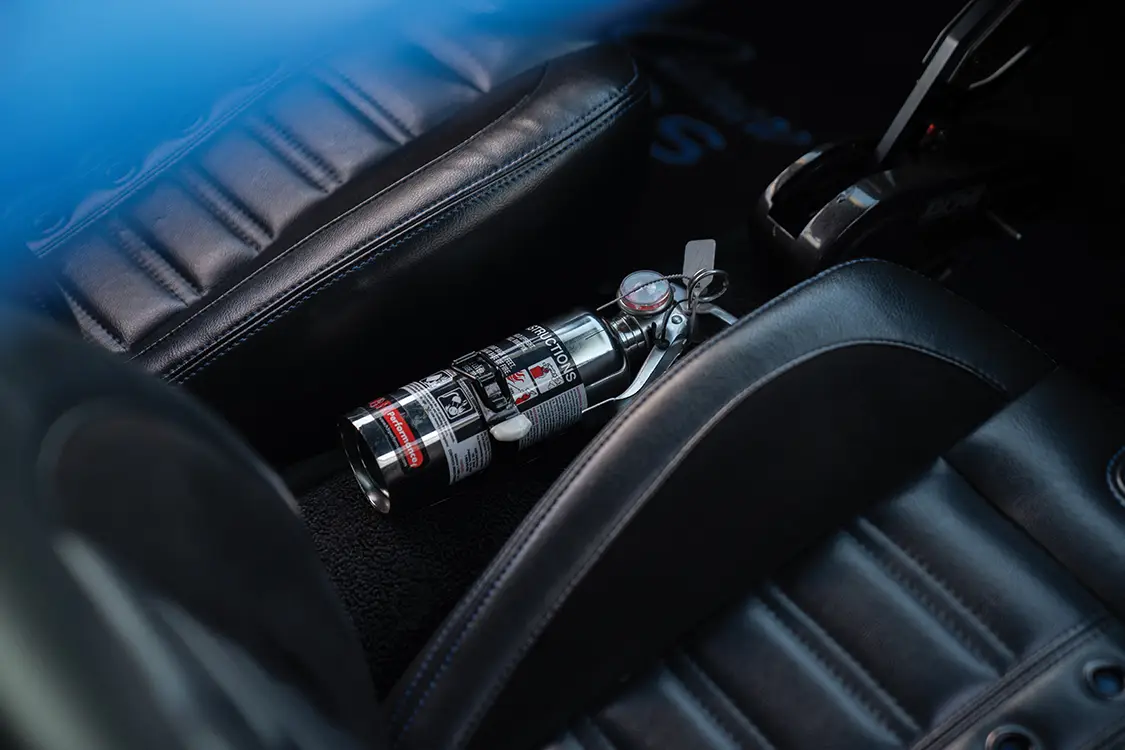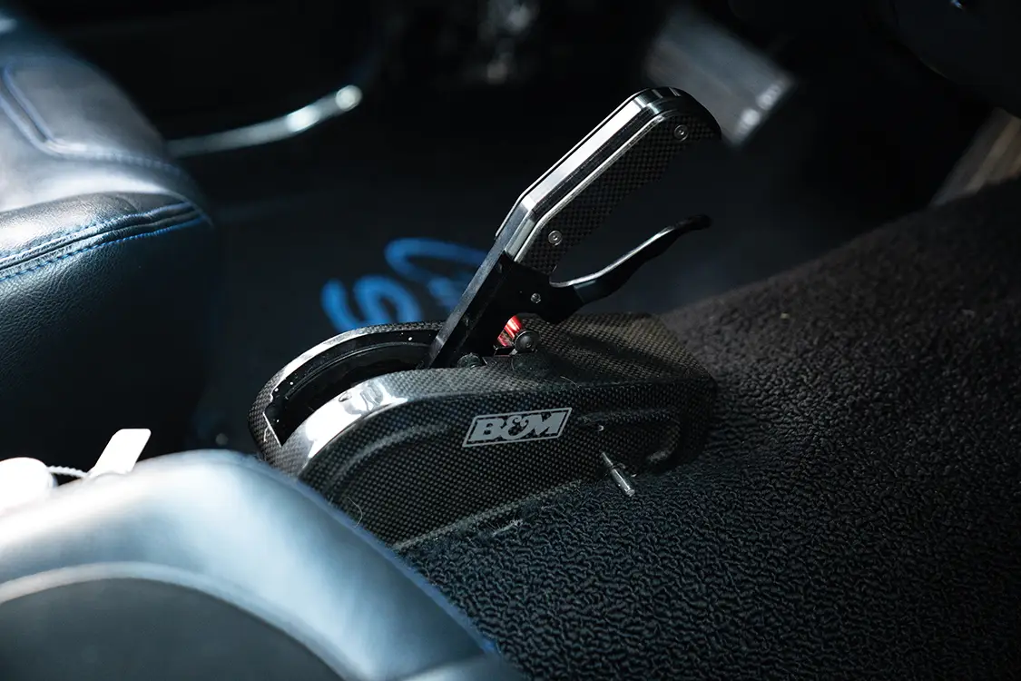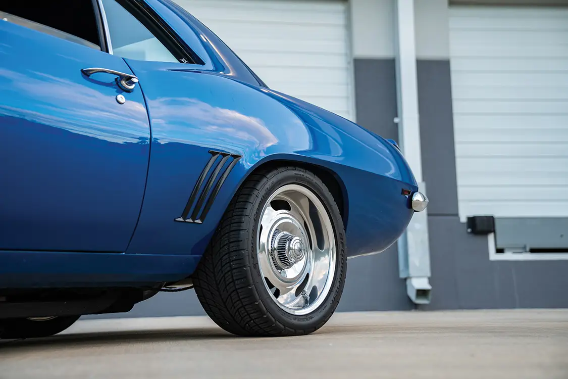 The chassis remains a stock subframe, but Jerry reinforced it himself with welded frame-connector braces, Koni front springs, Detroit Speed shocks front and rear, dropped upper and lower control arms, and a 1-inch front sway bar. Every bolt, he insists, felt his own torque wrench. American Racing 17-inch polished Rally wheels wrapped in BFGoodrich g-Force Comp-2 tires (245/45-17 front, 275/40-17 rear) for grip that matches the car’s attitude.