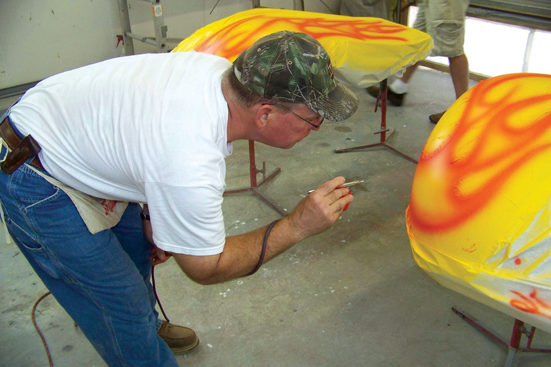 Specs and CAD files exchanged hands. The louvers were painstakingly reproduced. For the flame job, Martin scanned photos of the original Kid into SolidWorks CAD software and accurately reproduced Manual Reyes’ 1973 artistry, complete with side-to-side variations. Master painter/pinstriper Joey Hutson of Joey Hutson Artistry (West Monroe, Louisiana) paid homage to Reyes on the ’34. Just as Reyes had referenced Tommy the Greek by signing “Reyes ’53” on the original Kid in 1973, the Older Brother carries “Hutson ’73” as a tip of the hat to Reyes.