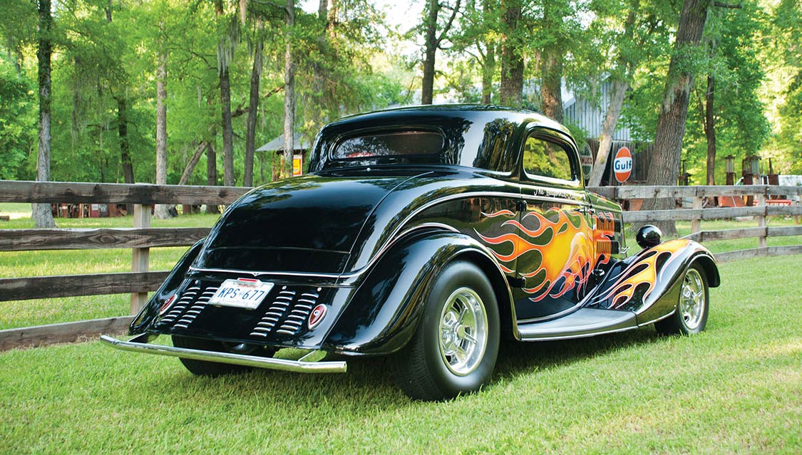 Body Mods: Top chopped 3 inches in the front, 2 ¾ inches in the rear, filled; Rootlieb ’33 hood with ’34 handles; Nottingham Reproductions ’33 grille, custom-punched louver size/shape/orientation per original Kid furnished by Jason and Jerry Slover; shaved trunk handle; rear pan louvered per the original; ’39 Ford taillights added to rear pan per the original; Pete & Jake’s front and rear Kid chrome bumpers; Dietz 7-inch headlights; Steve’s Auto Restoration steel fenders; Bob Drake Reproductions vulcanized rubber running boards