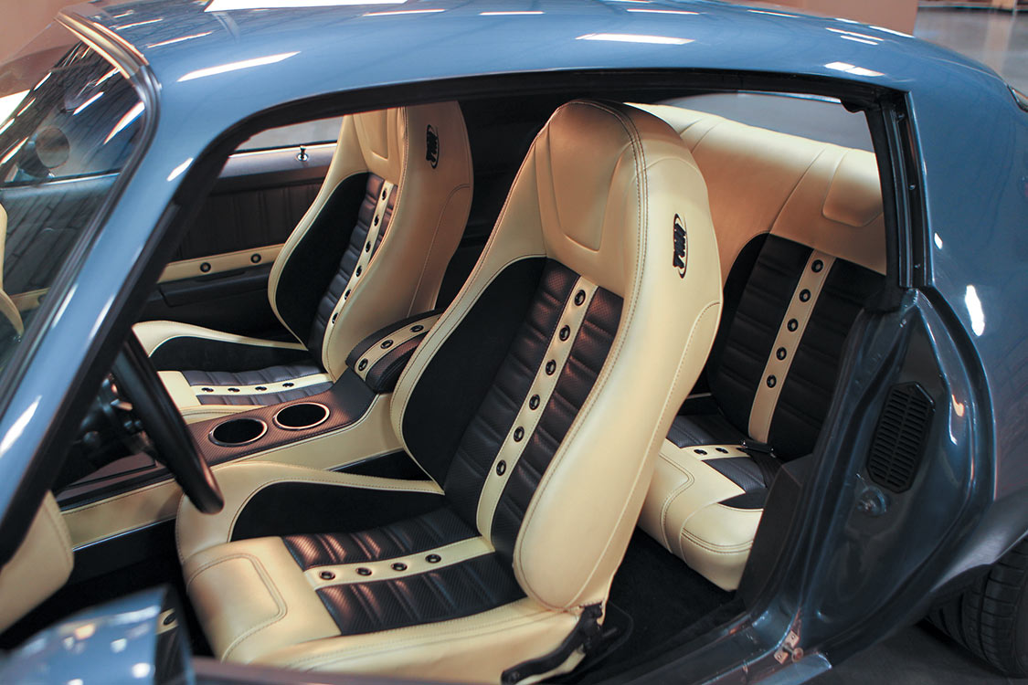 TMI’s Sport XR seat upholstery and foam, brushed aluminum door panel inserts on top of suede door inserts and suede headliner fill out the interior. Late Model Restoration supplied all of chrome pieces in the interior and under the hood.