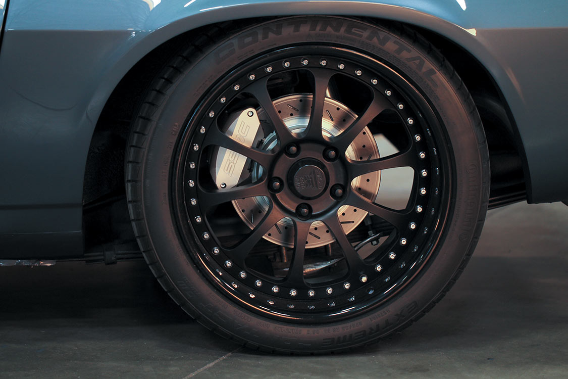 The wheels are Union Forged custom three-piece aluminum Lagunas, 18×8 front and 18×9.5 rear, wrapped in Continental DW tires. Suspension is handled Viking Performance coil-overs with UMI control arms.