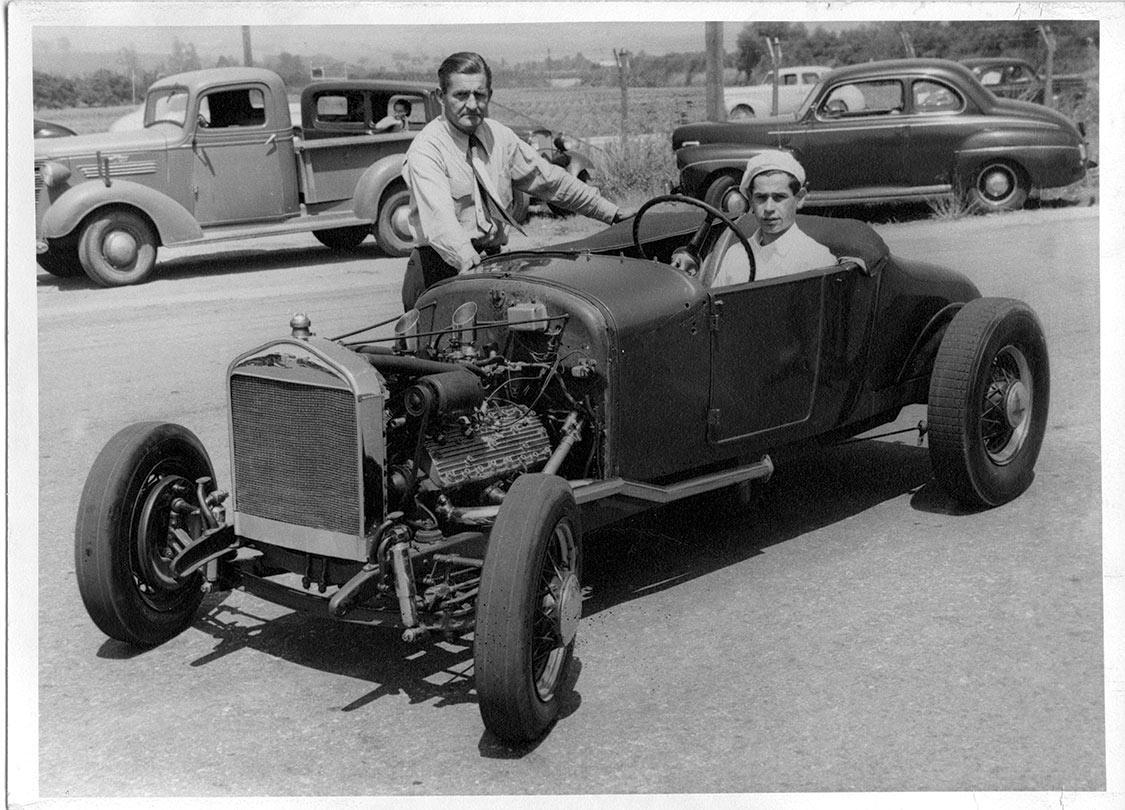 βWe were tearing around, and a lot of us gravitated to running our cars at El Mirage Dry Lake in San Bernardino Country, California. I was 21 years old the first time I ran my roadster there in late 1946. I had a cloth helmet, some goggles and an old Army surplus seatbeltβthat was it. The interest was so high, there were 51 cars just in my class. It was huge. They had a couple of sealed beams and pylons, and youβd go down there and just try to keep between them. Everyone wanted to say that they had gone 100 mph.