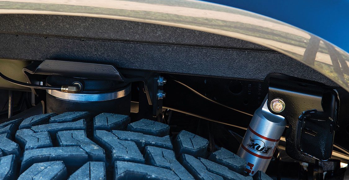 And although the chassis is mostly factory Ford, a few upgrades were made in the name of utility and comfort. A custom skid plate was fabricated, as was a new trailer hitch setup. Power AMP Research running boards were fit, and the suspension received Icon Vehicle Dynamics upper control arms, Deaver leaf springs and a Ridetech helper bag setup to keep things level when the 6.2L Raptor V-8 is under load.