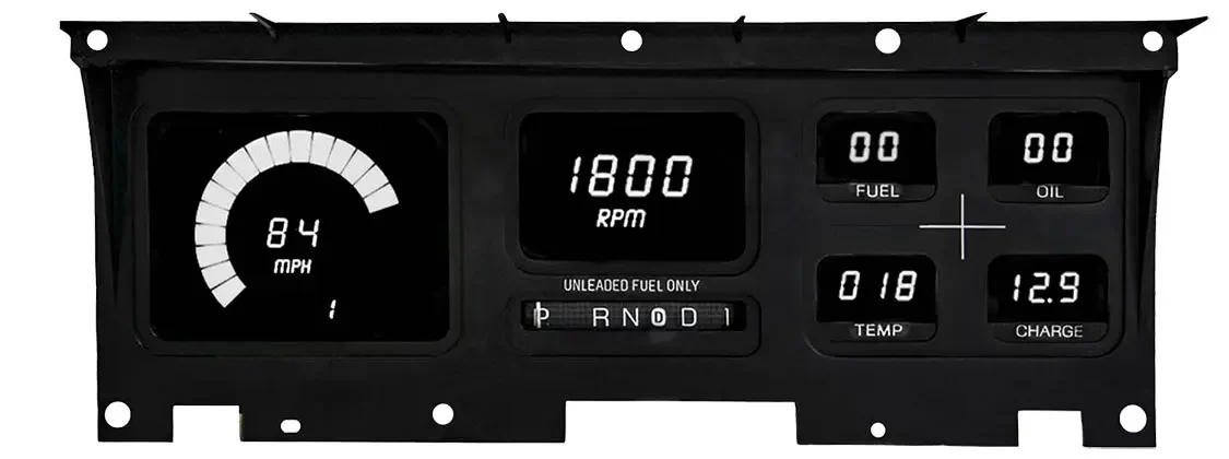 The panel also features turn signals and high beam indicators. Its speedometer reads up to 255 mph, and it features odometer, trip meter, one-button calibration (regardless of tire size, gear ratio, or transmission), 0-60 time, quarter-mile elapsed time, and high-speed recall, all with the push of a button. The speedometer can be used with electronic cruise control senders or use the included S9024 universal speedometer sending unit if your vehicle is not equipped with a functional cruise control. The bezel is not included.