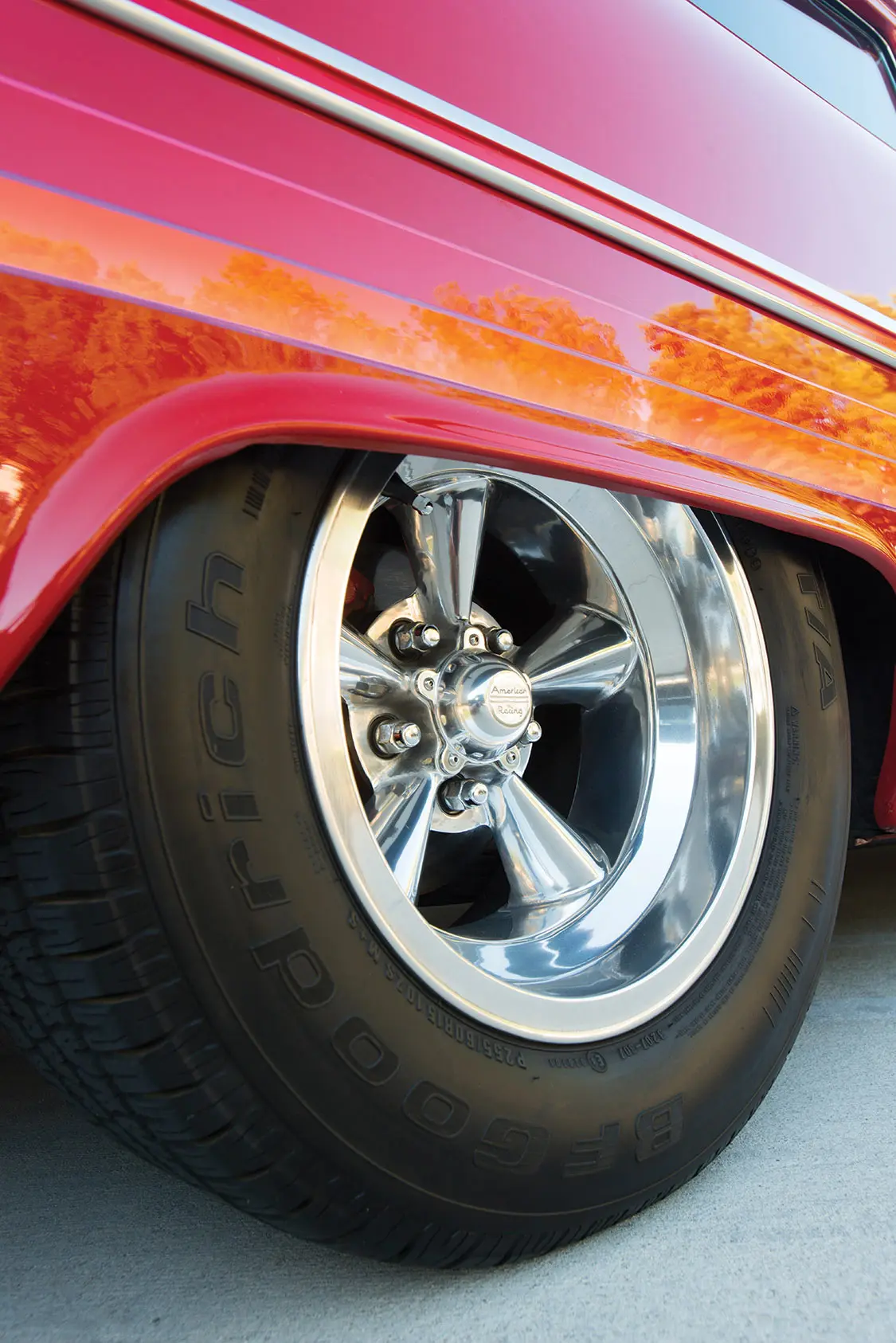 The rear end, a stout Ford 9-in., was chosen from a Lincoln Versailles for the width and disc brakes that fit under the unmolested ’55 fenders. Traction Master traction bars are utilized, too. “I selected the 9-in. for its strength and disc brakes, to replace the GM 12-bolt with drums that I had been using,” Dolman says.