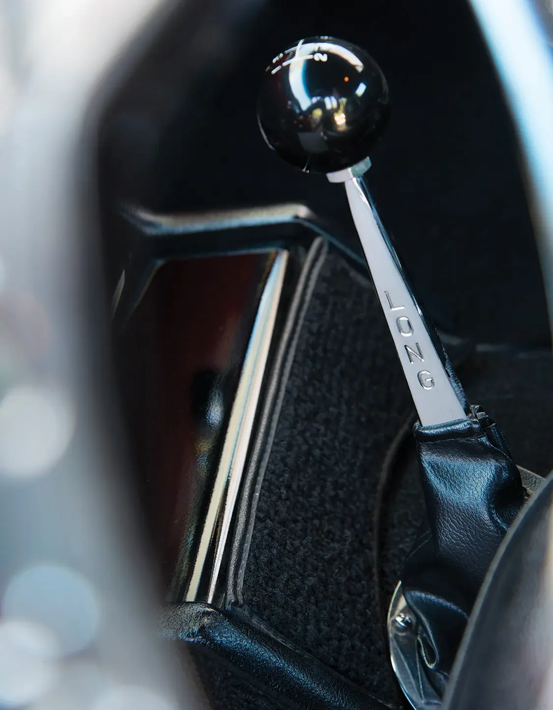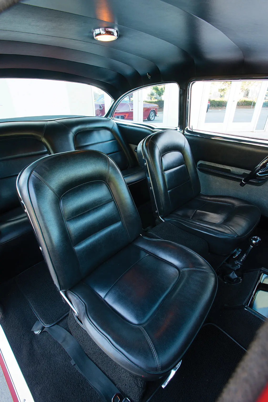 The interior, upgraded with 1964 Corvette bucket seats, is wrapped in the same black vinyl installed in 1979, and this part, too, remains impeccable. VDO gauges monitor the car’s vital signs and a later generation 5-in. Autometer tach broadcasts the revs.