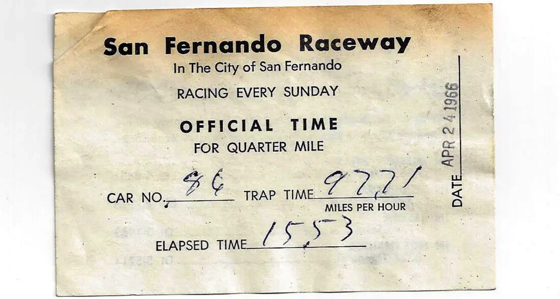Dolman has never babied his baby, slamming gears to wring the most out of the 327-cu.-in. 365-hp Corvette engine. He’s kept the timing slips to prove it. He recited from an old slip with an elapsed time in the 15s at 97 mph measured in the traps at the San Fernando drag strip. He earned that slip while the car was still running a 3-speed manual transmission and an open rear end.
