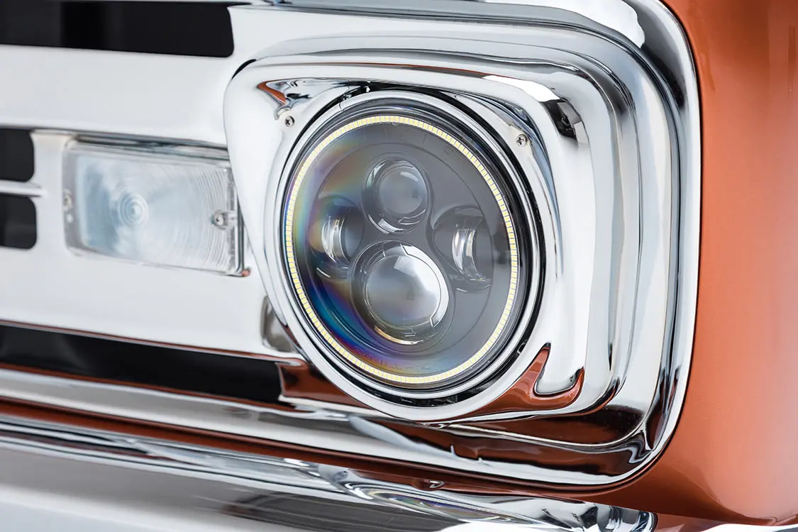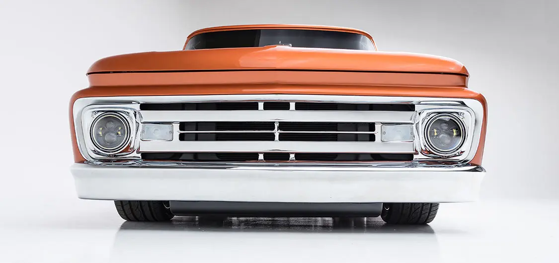 “The grille and bumpers are stock,” Mark says. “But we updated the wheelwells with custom tubs and crossovers, stretched the cab 3 inches, shortened the bed by 6 inches, and added shaved custom drip rails, a custom tailgate, bed strips, flush-mount glass front and rear, and welded body seams.”