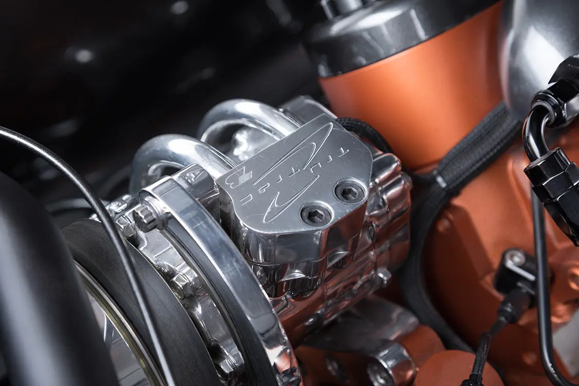 Unparalleled Performance in Nampa, Idaho, did all of Betsy’s engine work. Drew and his crew chose a 2013 GM V-8 LS3 6.2L motor and added Gen IV GM stock connecting rods, GM hypereutectic pistons and GM stock shocks rings at a 10.7:1 compression ratio. They used a BTR LS3 Stage 2 camshaft, Borla intake manifold and fuel injection, and Hooker BlackHart headers. The exhaust system—a 3-inch exhaust from the rear—comes from Borla and Kenny’s Rod Shop. Other engine mods include a Holley Dominator ECU, Billet Specialties hardware and a serpentine drive system, along with a polish and paint to make her pretty.
