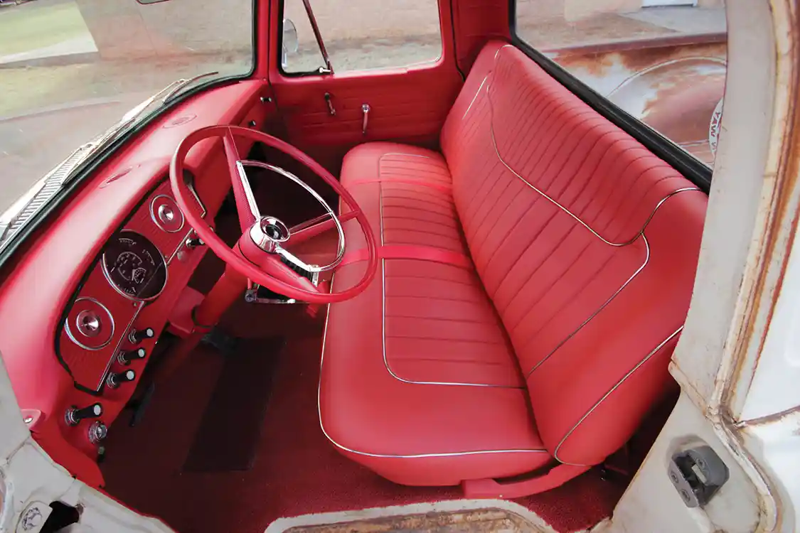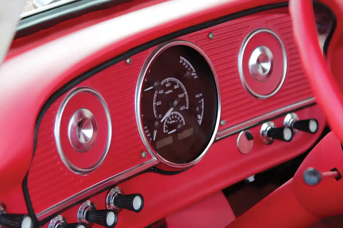 The interior of Jack’s truck is consistent with the formula. It matches factory style with modern functionality and a fierce attitude. It’s been coated top to bottom in matte red to match the motor and Nitto tire accents. The cab’s interior was fully built so that the red paint coats every inch, including the dash. Custom red loop carpet spreads over the floor, and the door panel and custom bench are wrapped in red leather to round out the monochromatic scheme. A pop of polish comes via Lokar shifter and silver seat piping. Finally, Pope’s team updated the gauge cluster with a Dakota Digital VHX unit.