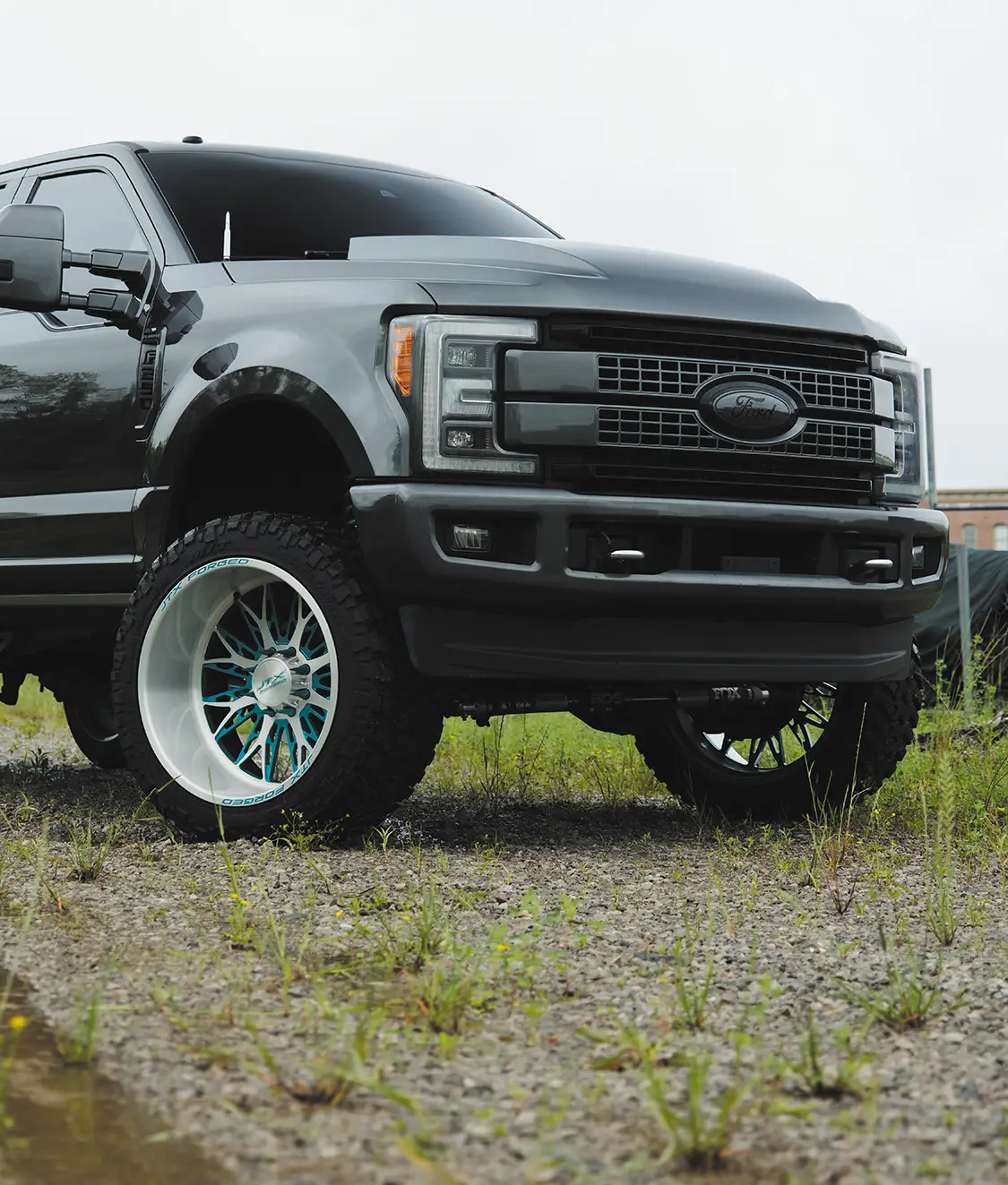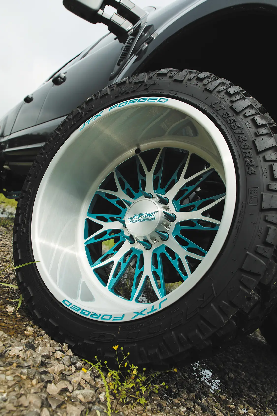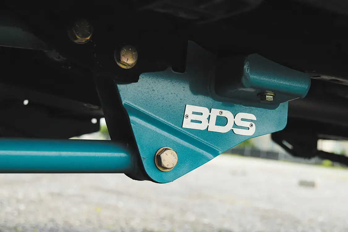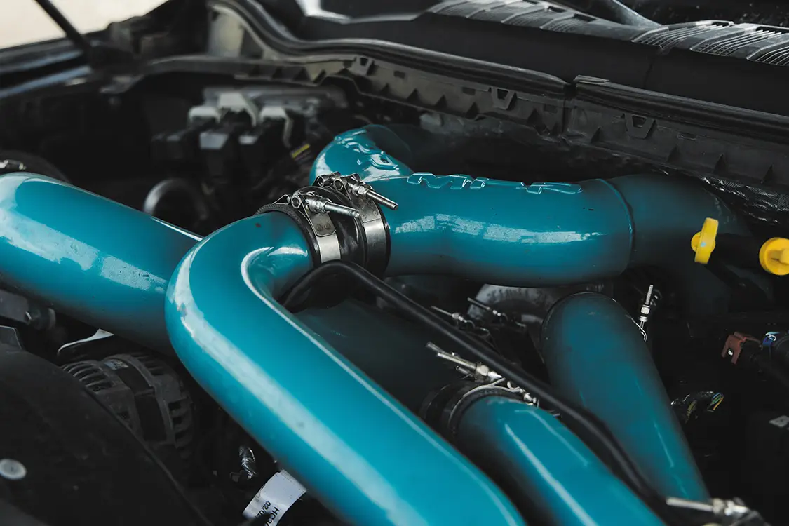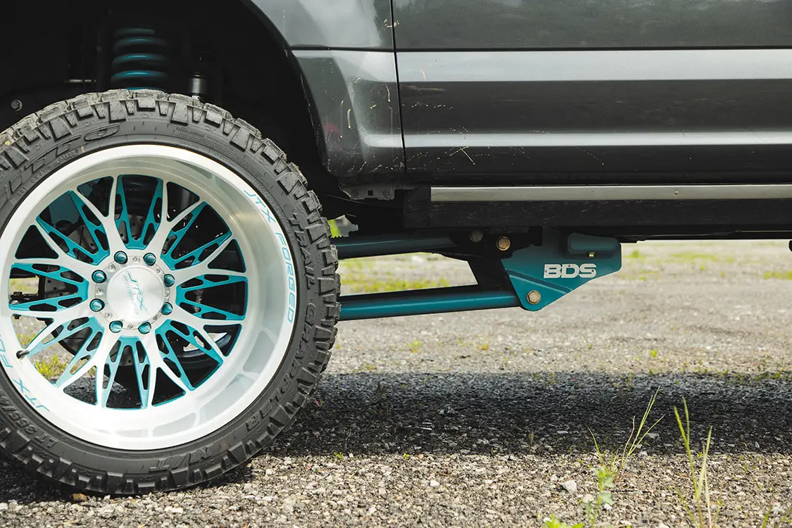 The goal was to build a daily driver that looked amazing and drove like a stock truck with some oomph behind it. Naturally, the motor was given a Stage 1 NoLimit Turbo and downpipe, an MPP piping kit, and a NoLimit intercooler to wake it up. Chris mentioned the only real “problem” they ran into during the process was that the downpipe needed a little aggressive persuasion to fit perfectly, as without any modifications it would rattle and vibrate against the firewall, making for quite the racket inside the cabin. They simply massaged the firewall with a mallet until the downpipe cleared and made no more rattling noises! The suspension is a super clean BDS six-inch lift kit that’s been powdercoated Prismatic Colors Fairy Dust Teal, coupled with Fox shocks front and rear. The 24×14 JTX Forged Paradigm wheels in the two-tone brushed and Fairy Dust Teal look awesome and match the suspension perfectly. Chris told us that it was one of the best daily driving trucks he has owned and absolutely loves how it turned out.