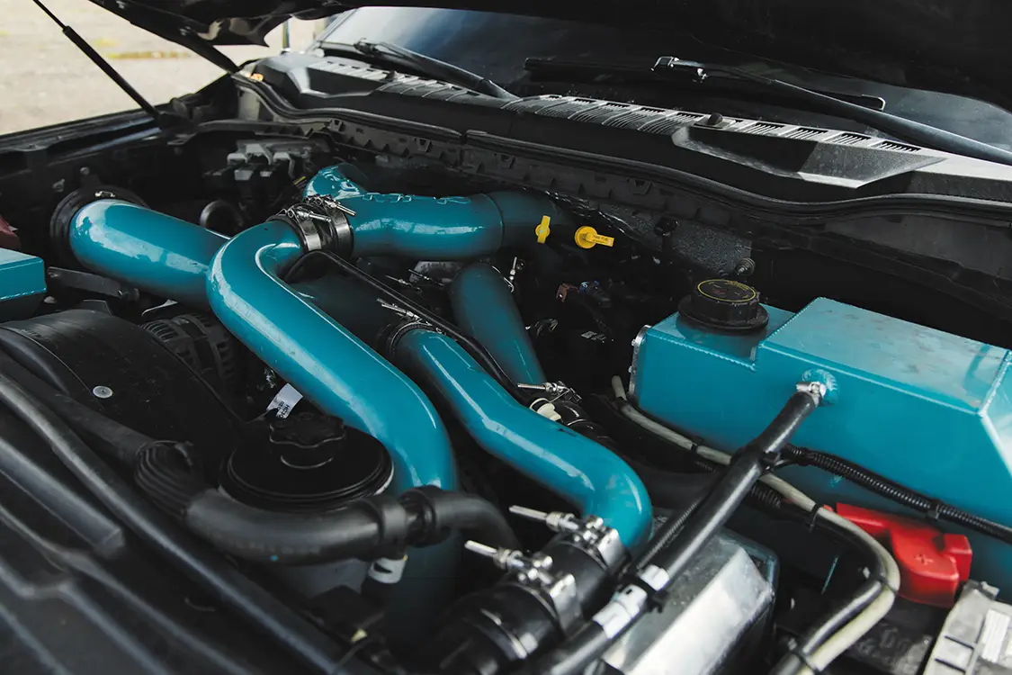 The goal was to build a daily driver that looked amazing and drove like a stock truck with some oomph behind it. Naturally, the motor was given a Stage 1 NoLimit Turbo and downpipe, an MPP piping kit, and a NoLimit intercooler to wake it up. Chris mentioned the only real “problem” they ran into during the process was that the downpipe needed a little aggressive persuasion to fit perfectly, as without any modifications it would rattle and vibrate against the firewall, making for quite the racket inside the cabin. They simply massaged the firewall with a mallet until the downpipe cleared and made no more rattling noises! The suspension is a super clean BDS six-inch lift kit that’s been powdercoated Prismatic Colors Fairy Dust Teal, coupled with Fox shocks front and rear. The 24×14 JTX Forged Paradigm wheels in the two-tone brushed and Fairy Dust Teal look awesome and match the suspension perfectly. Chris told us that it was one of the best daily driving trucks he has owned and absolutely loves how it turned out.