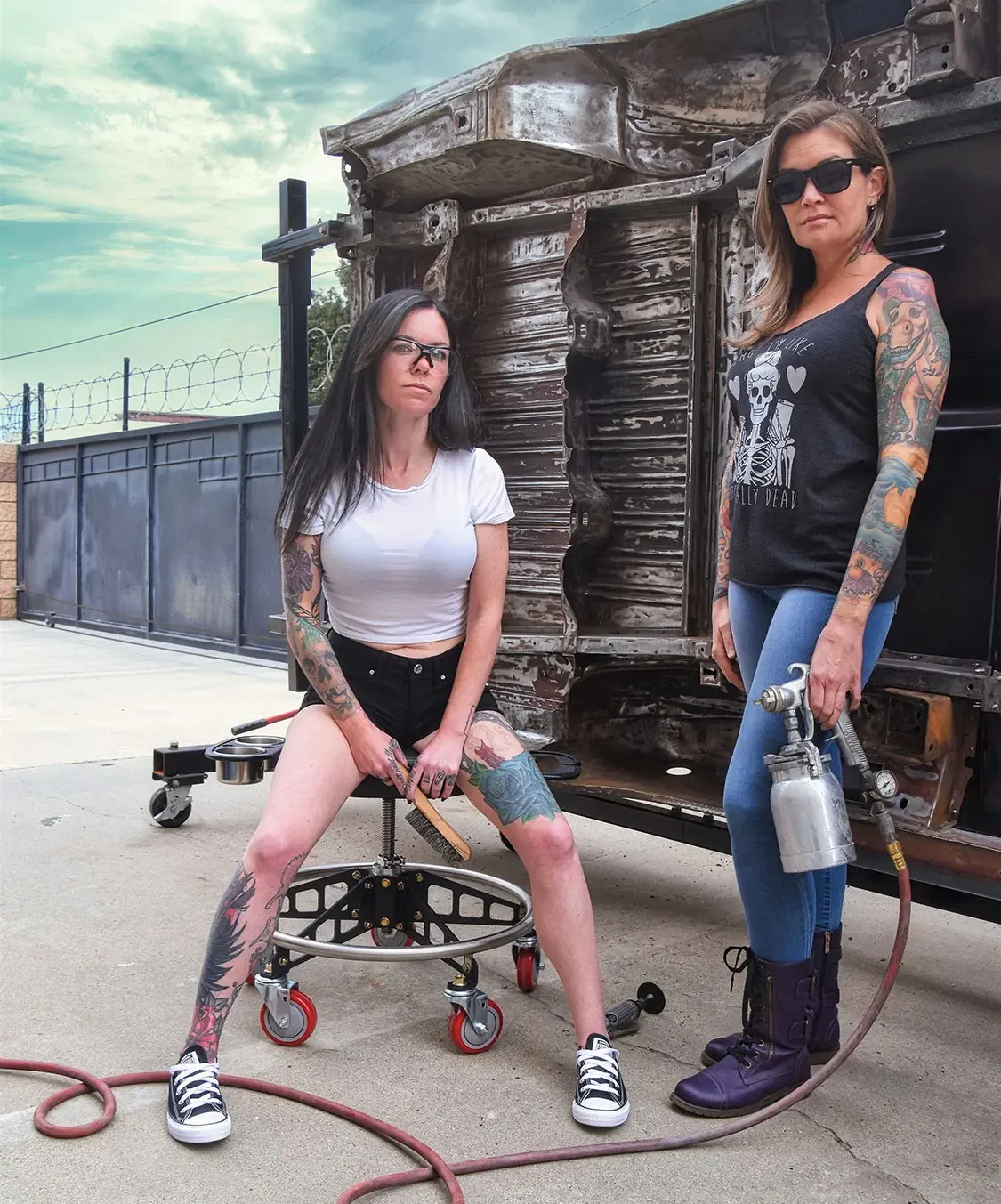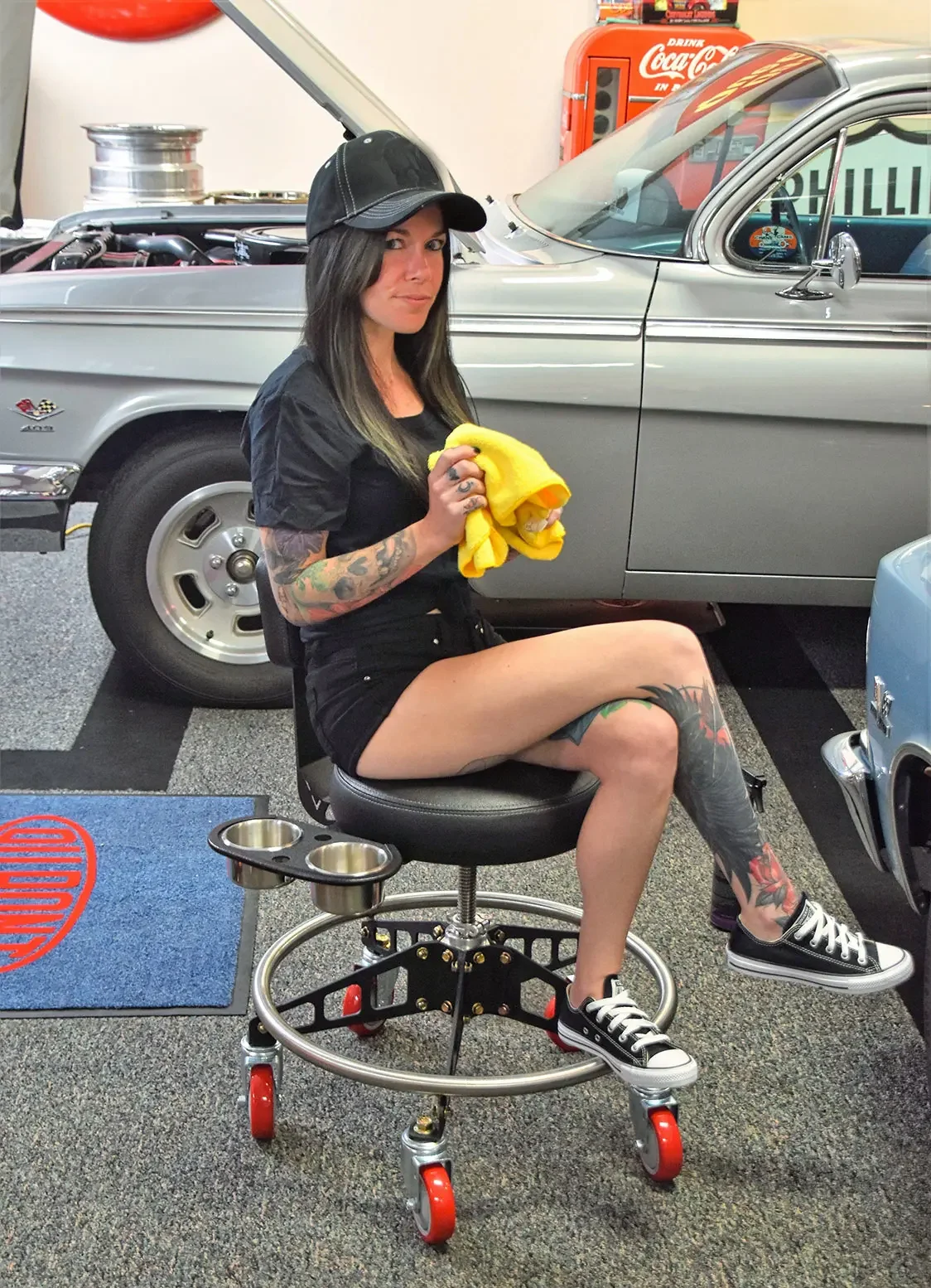 We were impressed with this new-age shop seat while at the SEMA Show and wanted to give it a test drive in the real world of automotive shops. We knew a shop that had one and we took a short drive to go check it out. When we got there, to our surprise, there were two young ladies learning the auto body trade. Steve Faist owner of the shop said they had a ‘67 Nova wagon on a huge rotisserie and working on the car’s undercarriage.